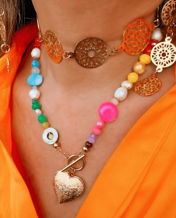 Collar tipo choker hecho de 6 figuras en forma de moneda caladas. Todo el collar es hecho de bronce con enchape en oro de 24k.