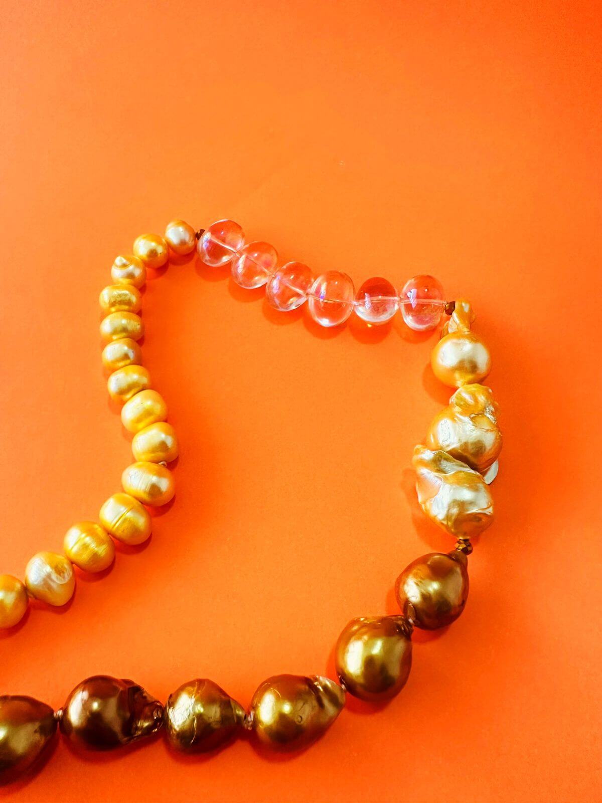 Collar hecho con perlas japonesas cultivadas de distintos tonos, cristales ovalados y dije en forma de Concha con laminilla de oro en borde. Broche salvavidas.