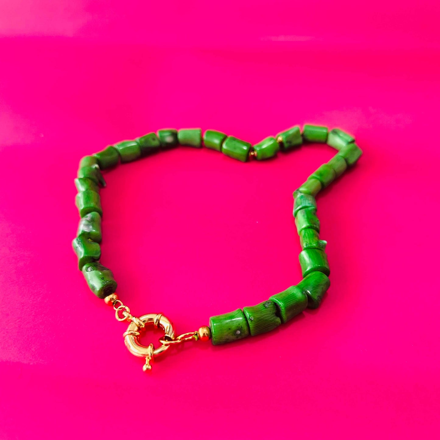 Collar hecho a mano con corales verdes irregulares y broche de bronce con enchape en oro de 24k.