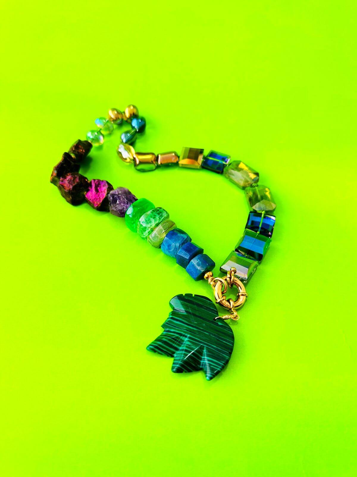 Collar de mix de piedras semipreciosas, drusas, cristales boreales y dije en forma de hoja de Malaquita.