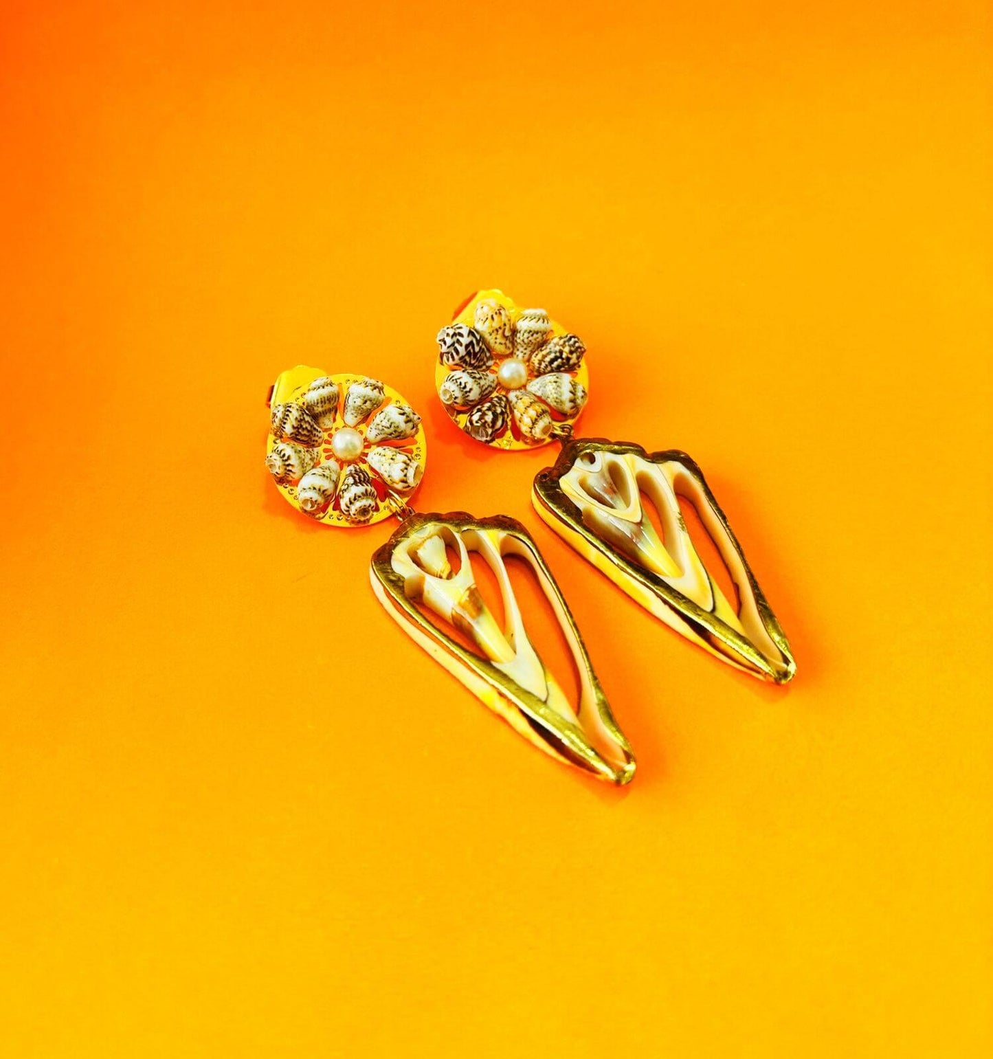 Aretes hechos con topo hecho de moneda calada de bronce con enchape en oro de 24k, bordado también con caracoles y colgando, nacar beige con laminilla de oro en borde.