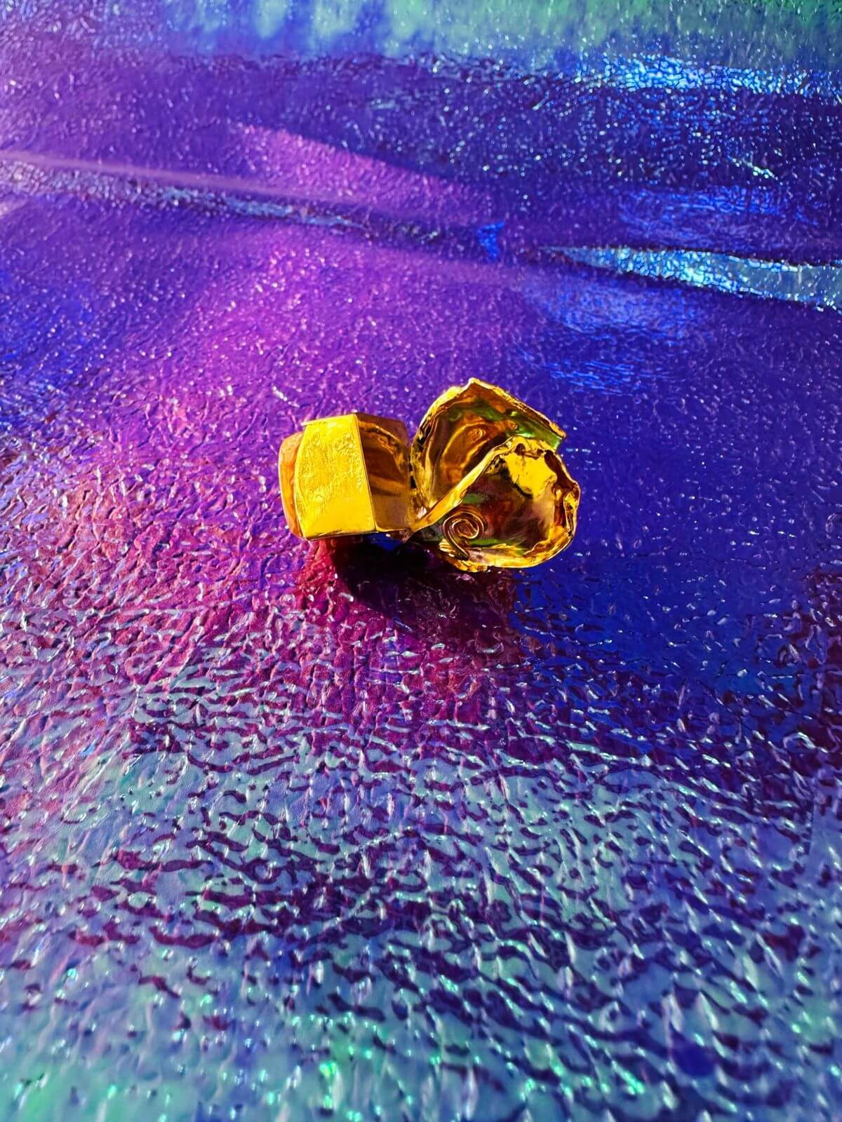 Anillo torcido con textura arrugada y con arabescos hecha a mano de bronce con enchape en oro de 24k y engaste de agatha naranja en forma de cubo.