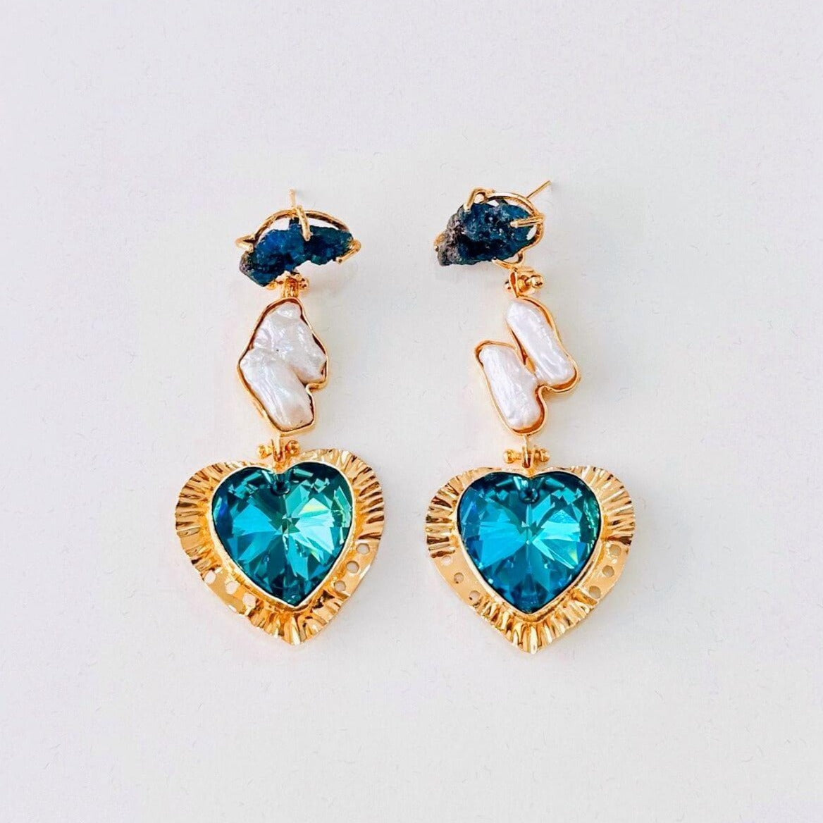 Aretes cascadas de tres dijes, hechos completamente a mano. Engaste por engaste. Hechos de bronce con enchape en oro de 24 y engaste de cristal Swarovski de la linea "Fancy Stones", drusas y sticks de perla japonesa cultivada.