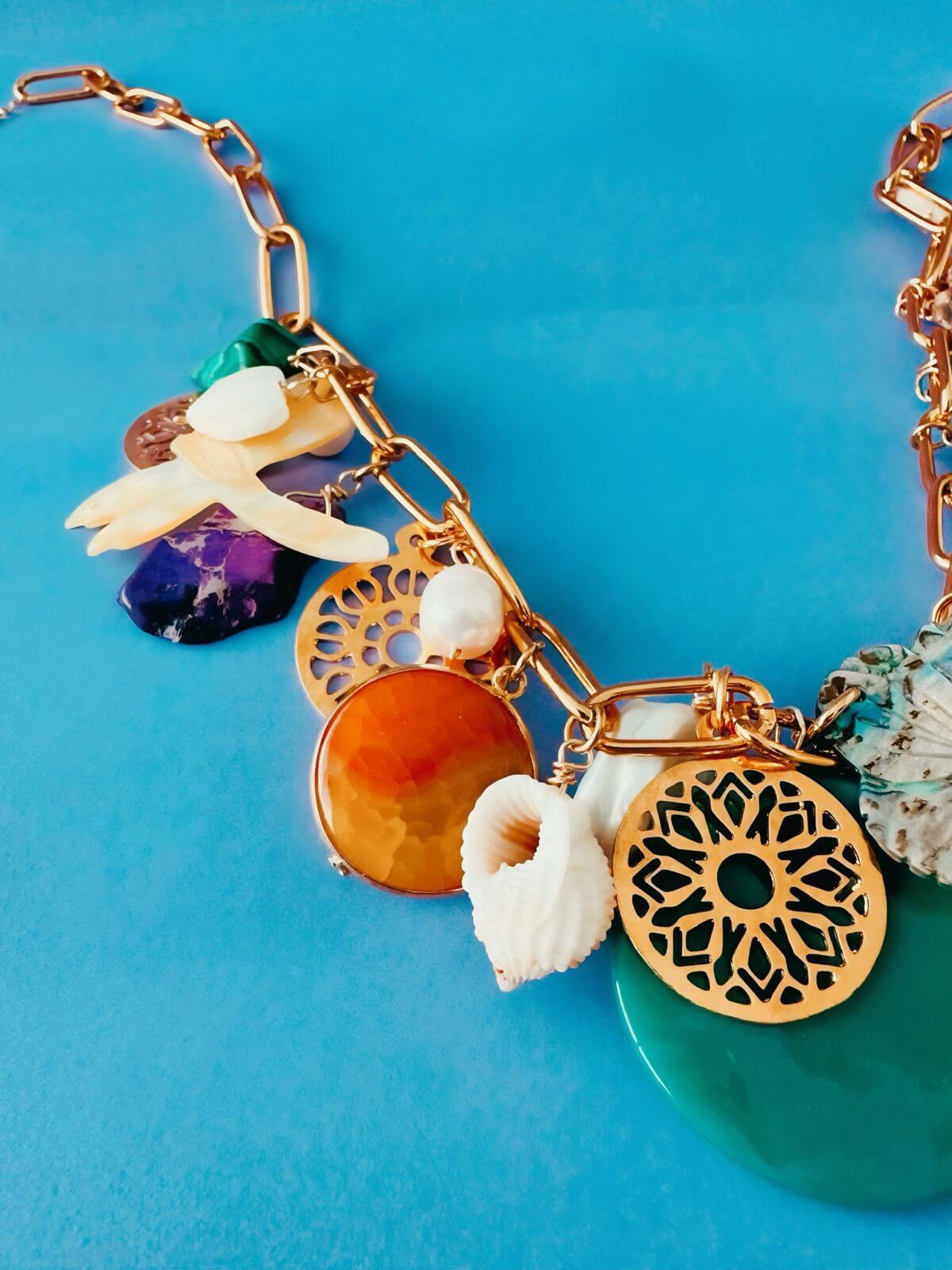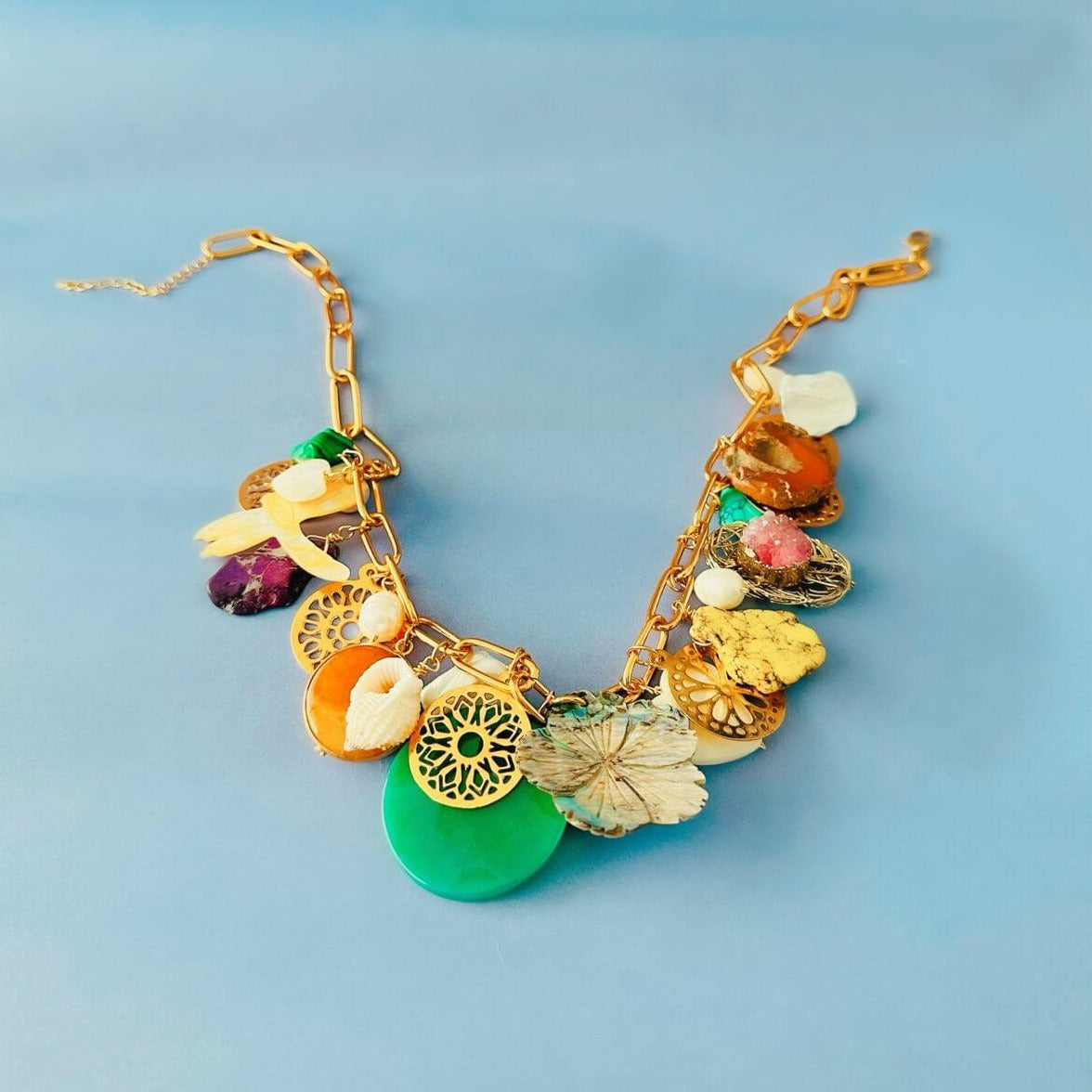Collar hecho con cadena de eslabones rectangulares con enchape en oro de 24k y colgando distintos dijes hechos en: Nácar abalone, nácar blanco, drusas, ágatas, malaquita, perlas japonesas cultivadas, conchas, turquesa y monedas caladas. Con cadena extensora.
