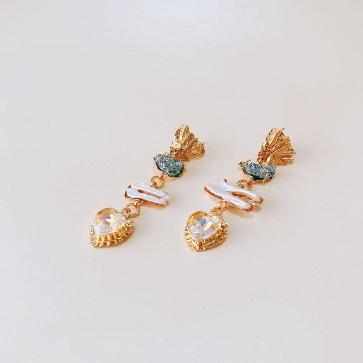 Aretes cascadas de tres dijes, hechos completamente a mano. Engaste por engaste. Hechos de bronce con enchape en oro de 24 y engaste de cristal Swarovski de la linea "Fancy Stones" , drusas y sticks de perla japonesa cultivada.