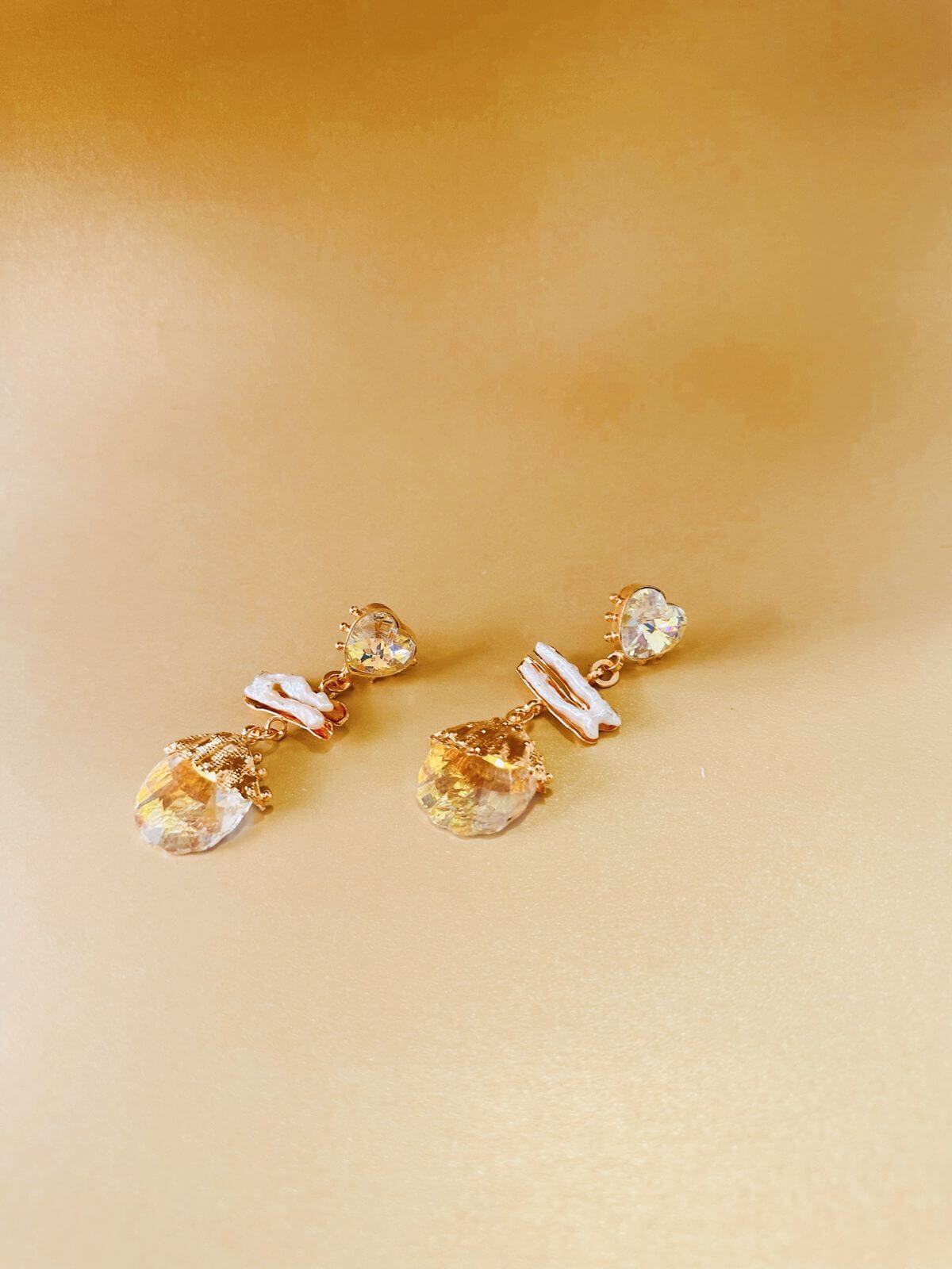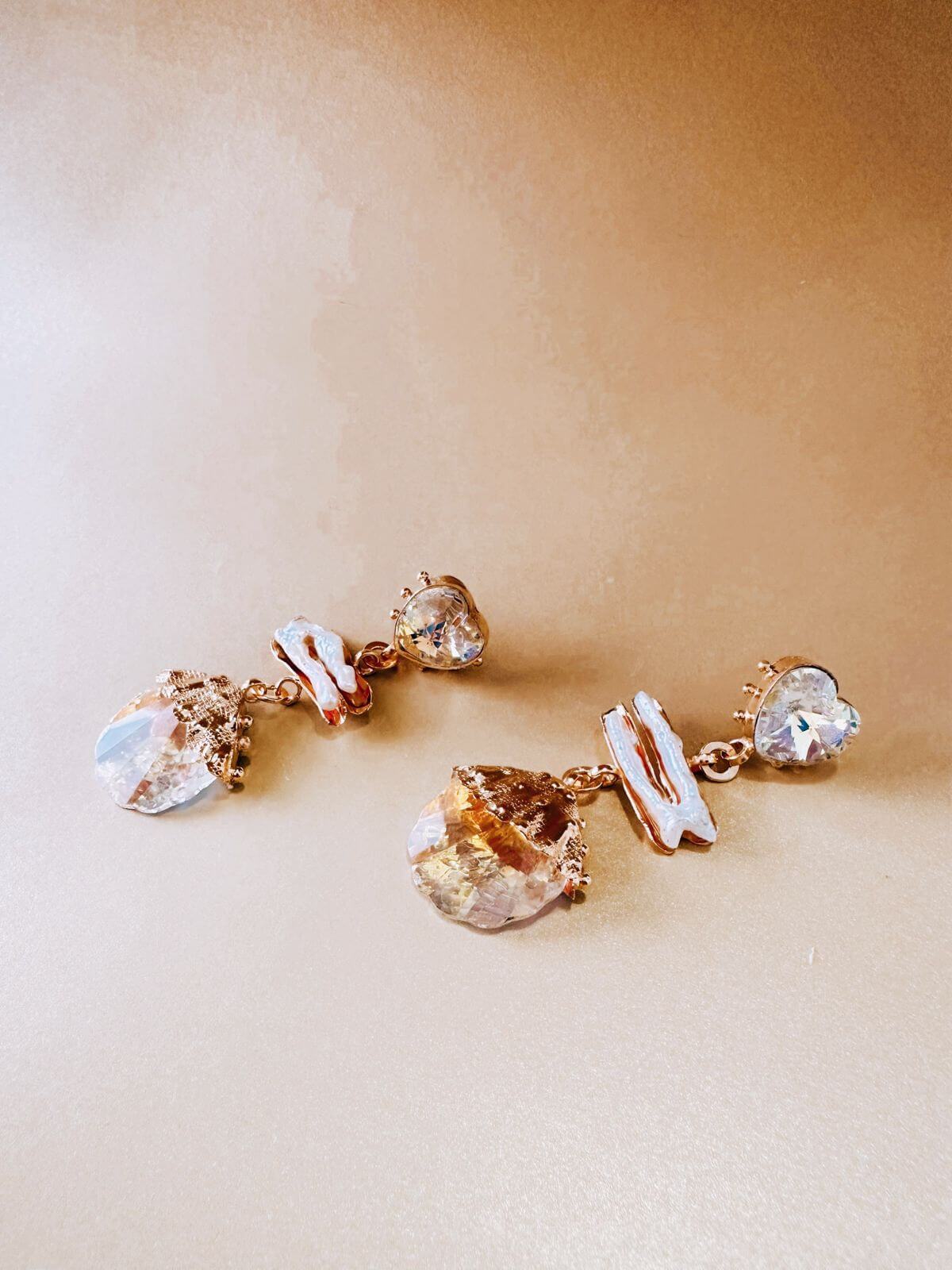 Aretes cascadas de tres dijes, hechos completamente a mano. Engaste por engaste. Hechos de bronce con enchape en oro de 24 y engaste de cristal Swarovski de la linea "Fancy Stones" y sticks de perla japonesa cultivada.
