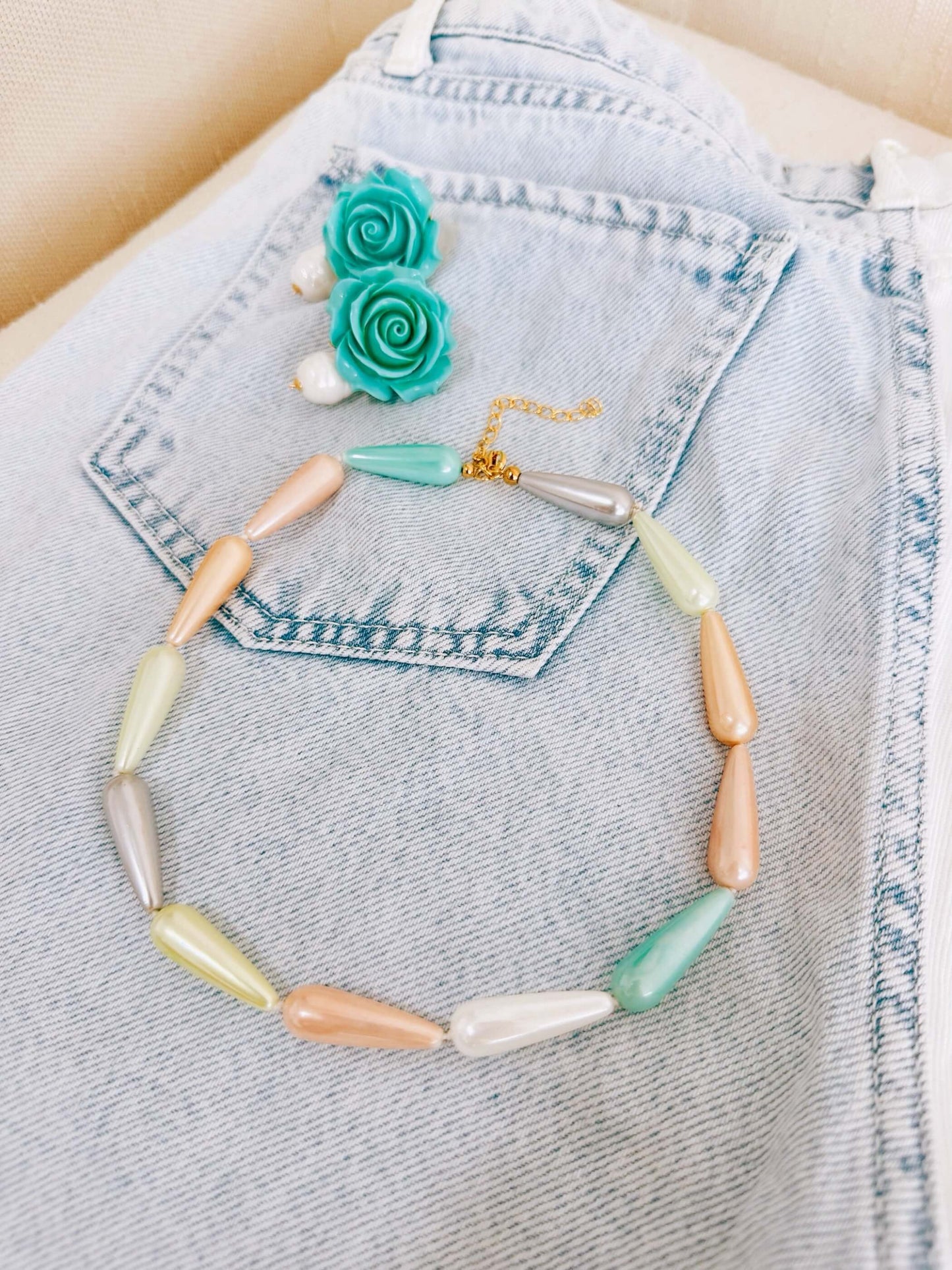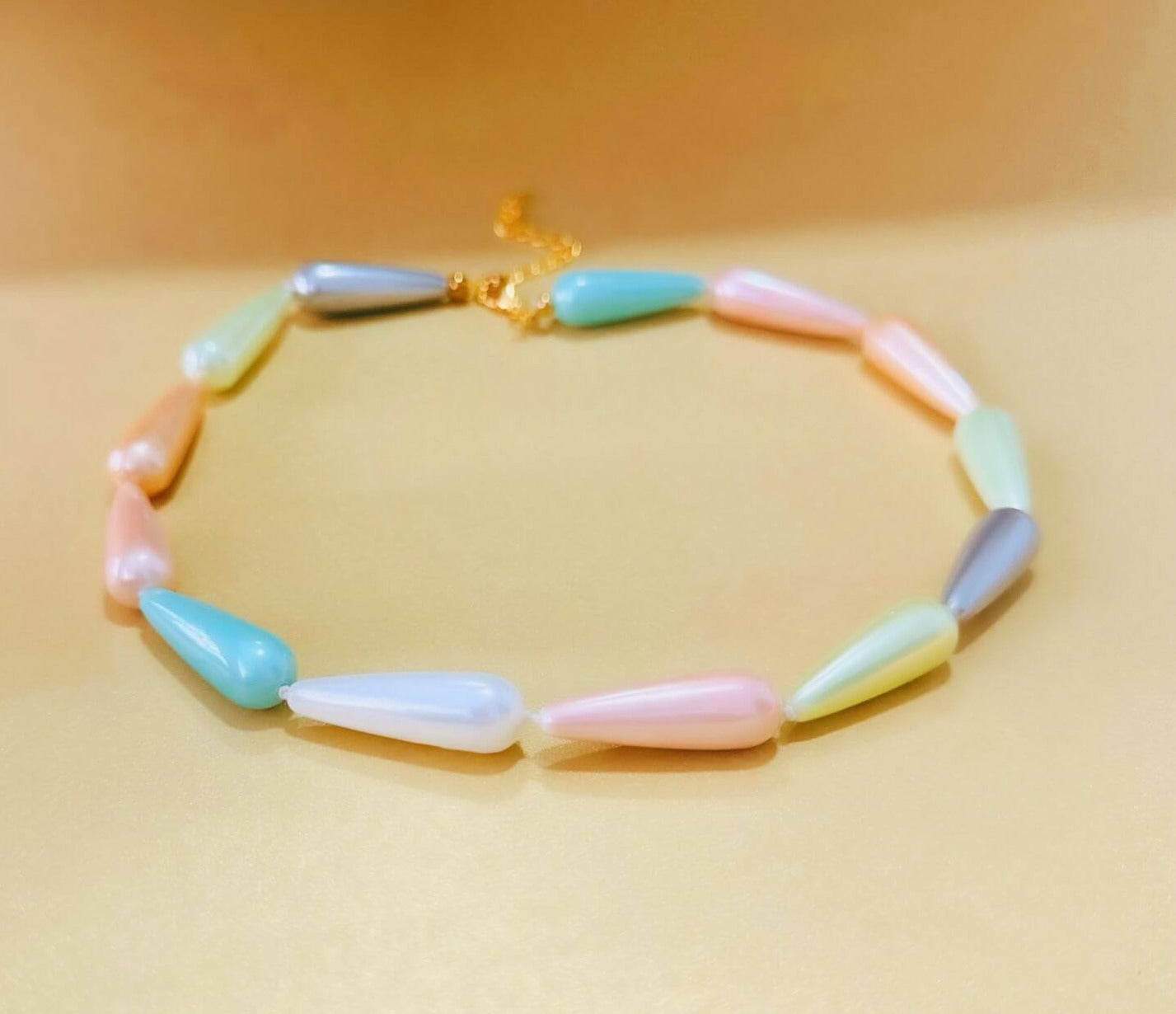 Collar hecho a mano con sarta completa de perlas shell en forma de gota. Broche pico loro y cadena extensora para adaptar.