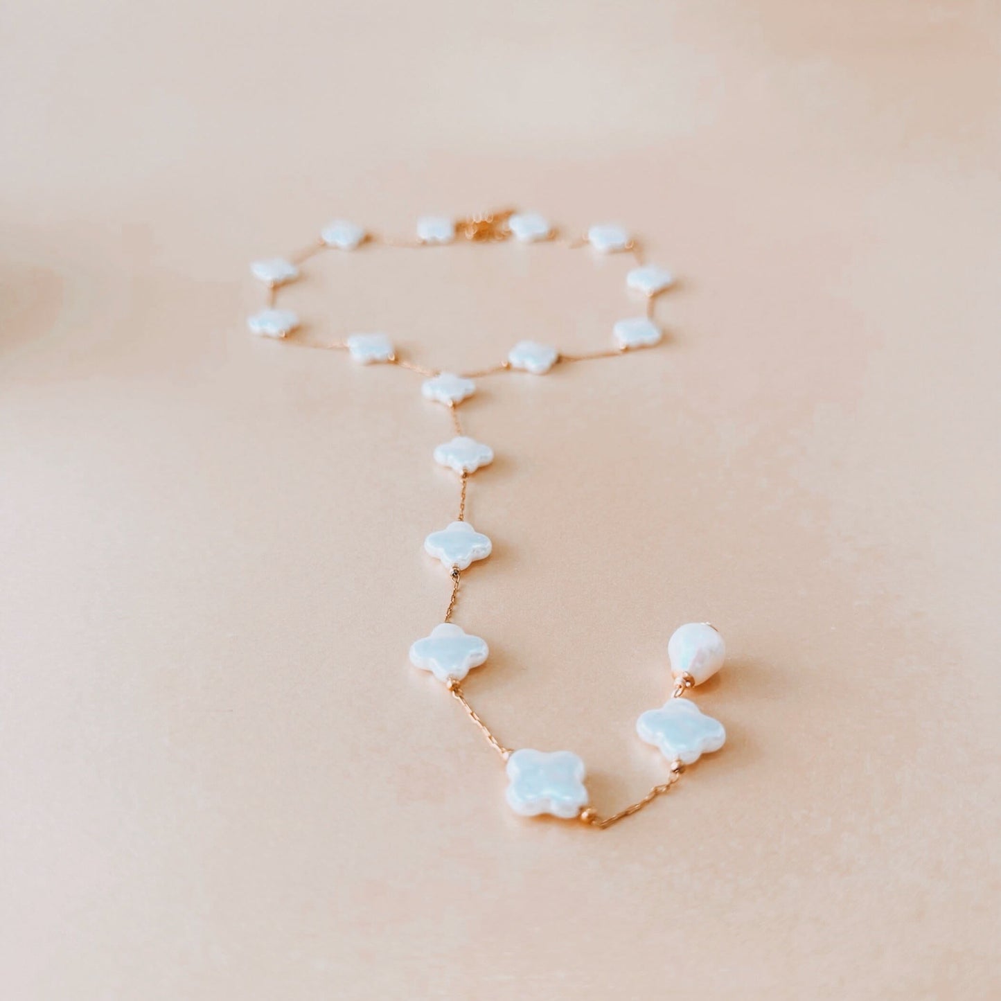 Collar largo hecho con cadena enchapa en oro de 24k y perlas shell en forma de flor en los intermedios. Adicional cadena extensora y broche picoloro.
