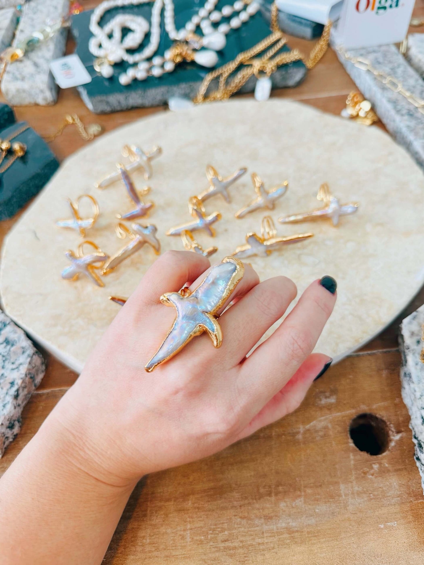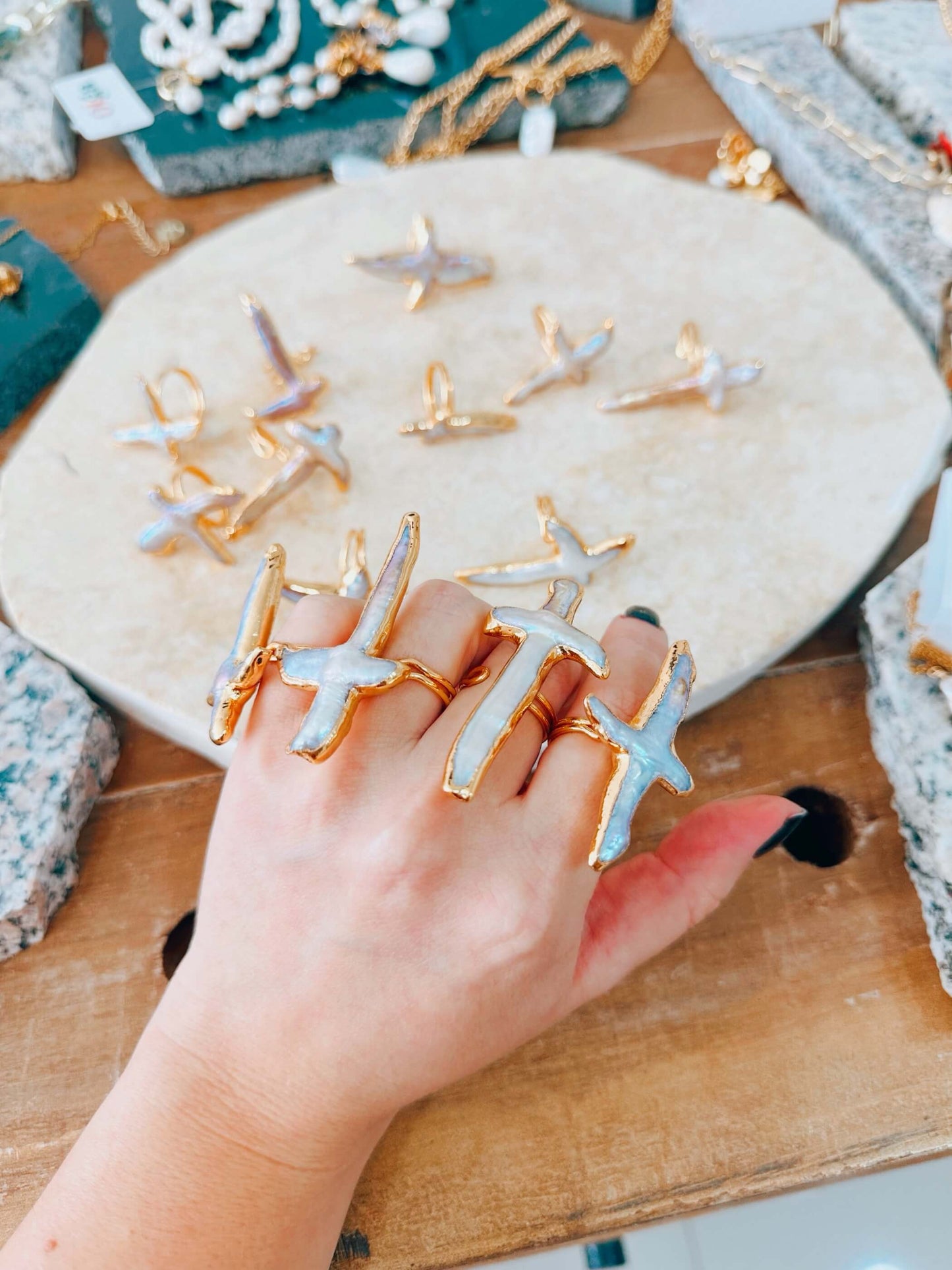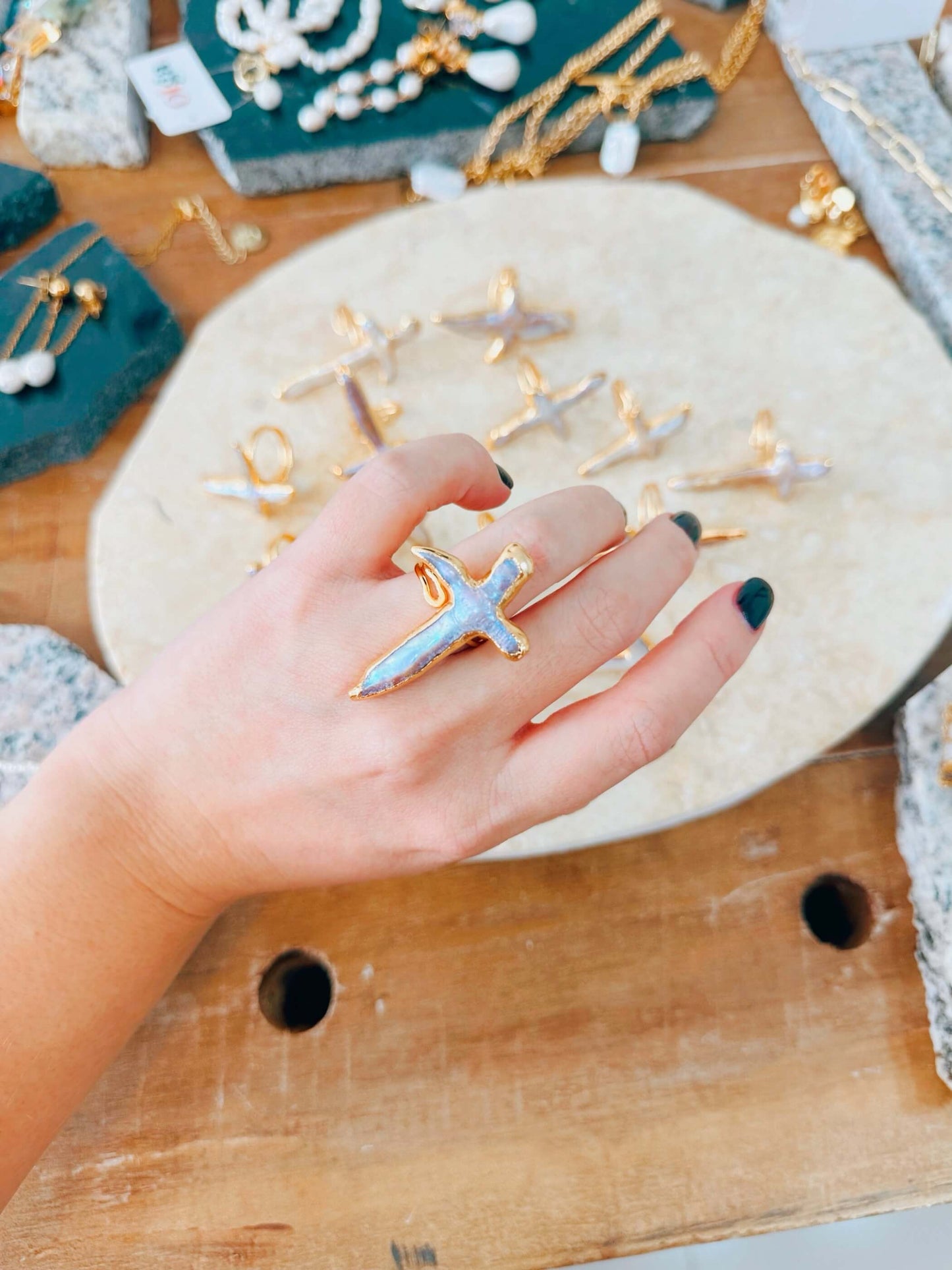 Anillo hecho a mano de bronce con enchape de oro de 24k y perla japonesa cultivada engastada en forma de cruz.