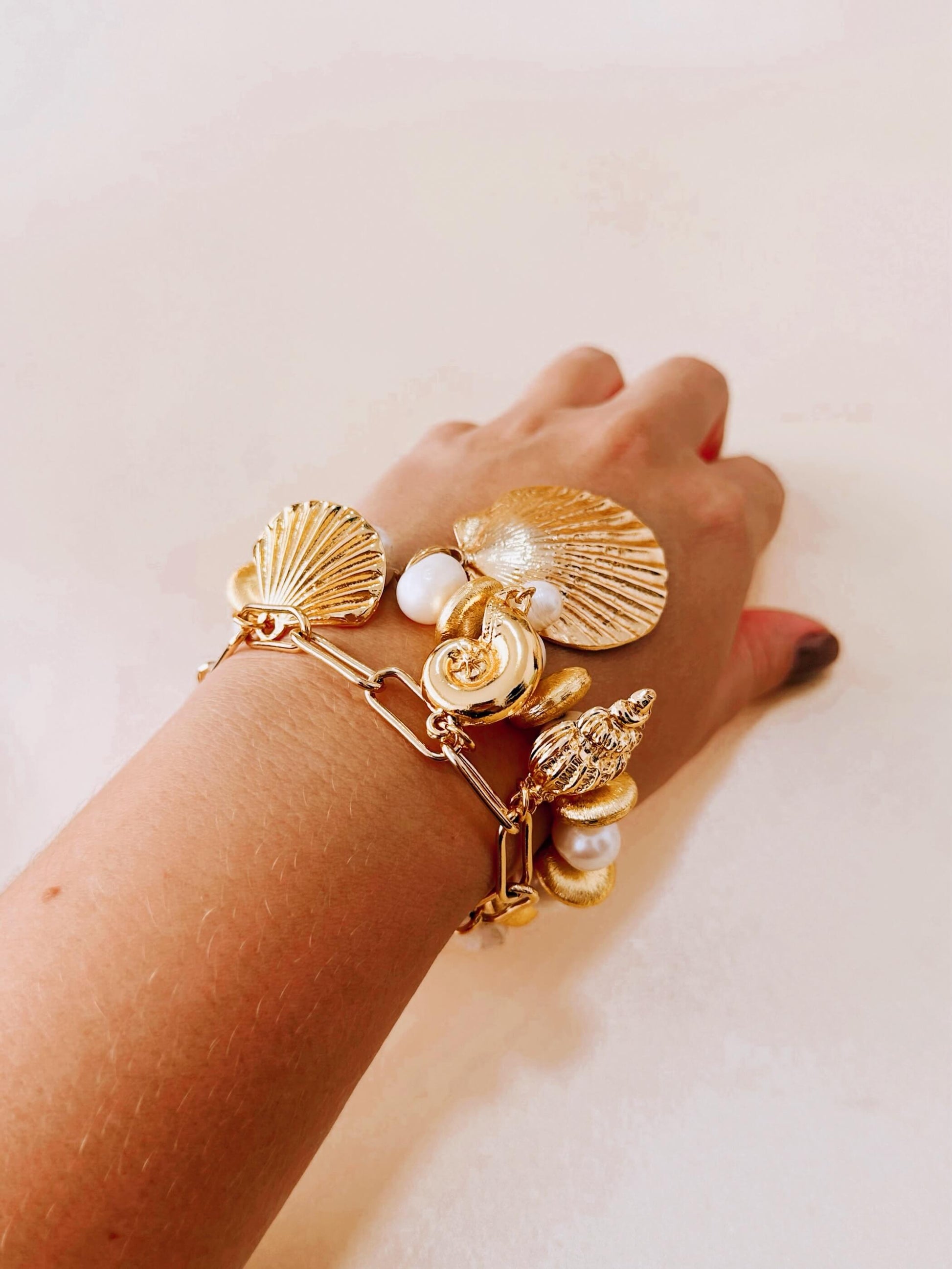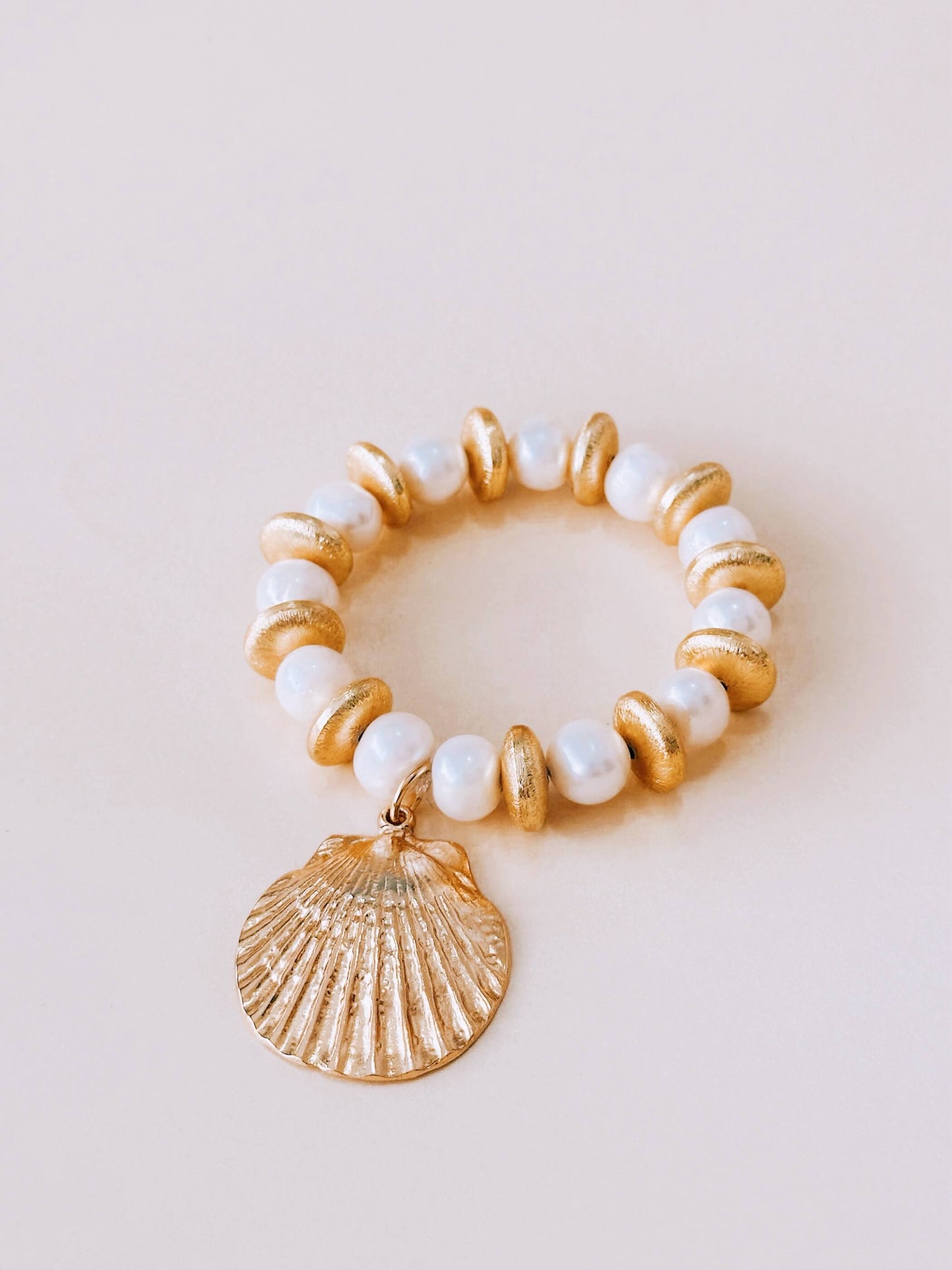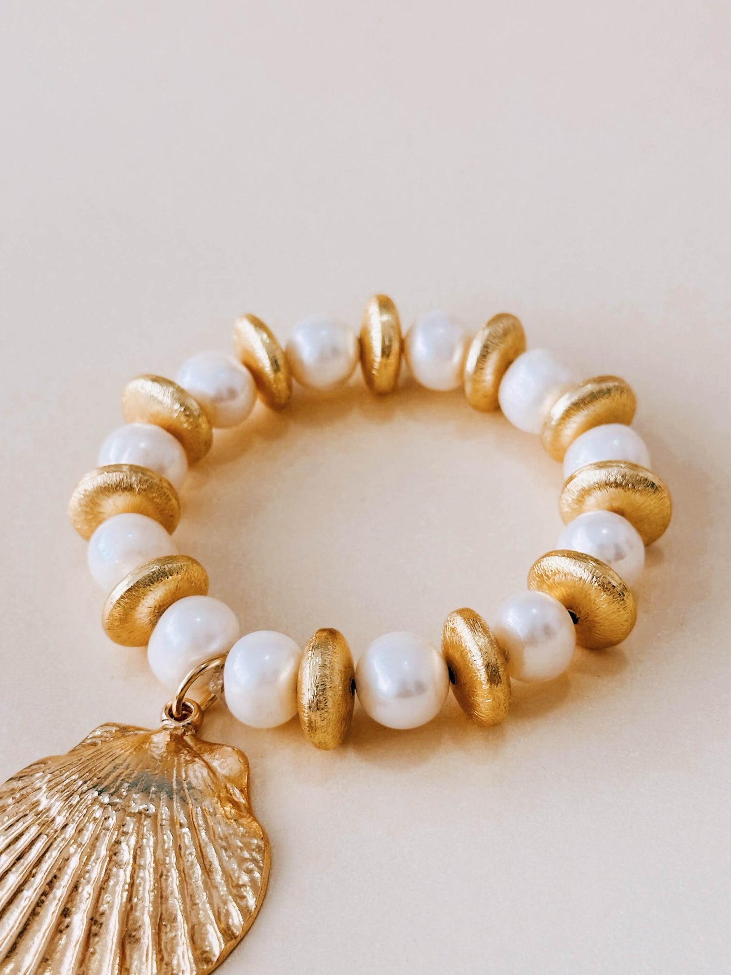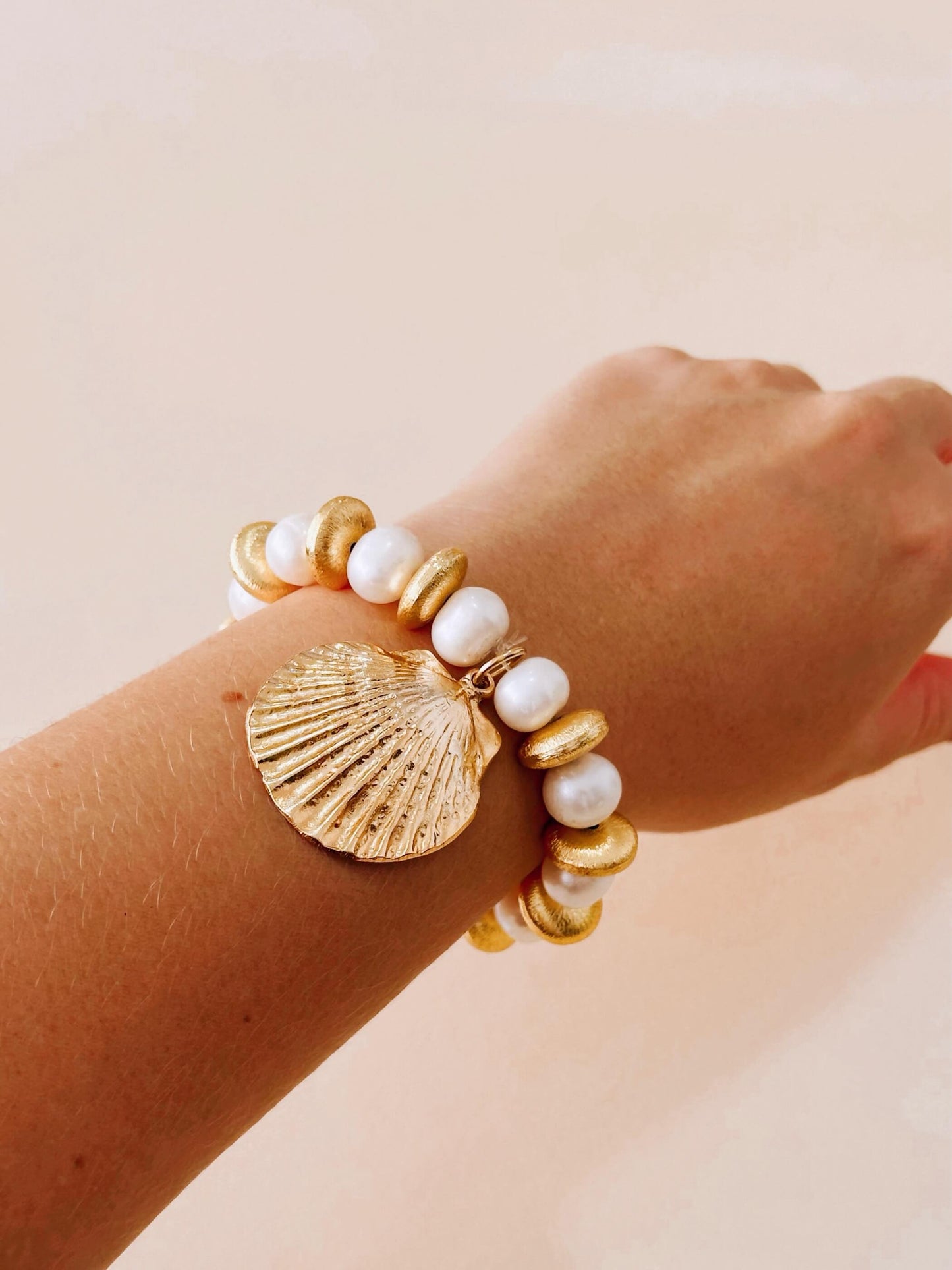 Pulsera hecha con perlas cultivadas con el mejor oriente, donas y dije hechos de bronce con enchape en oro de 24k.