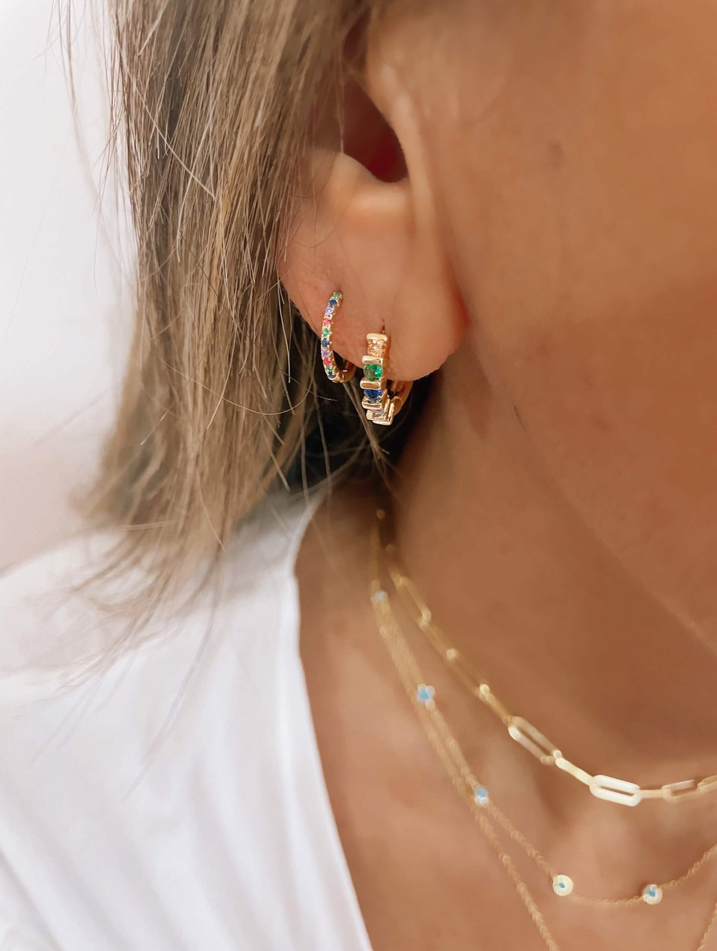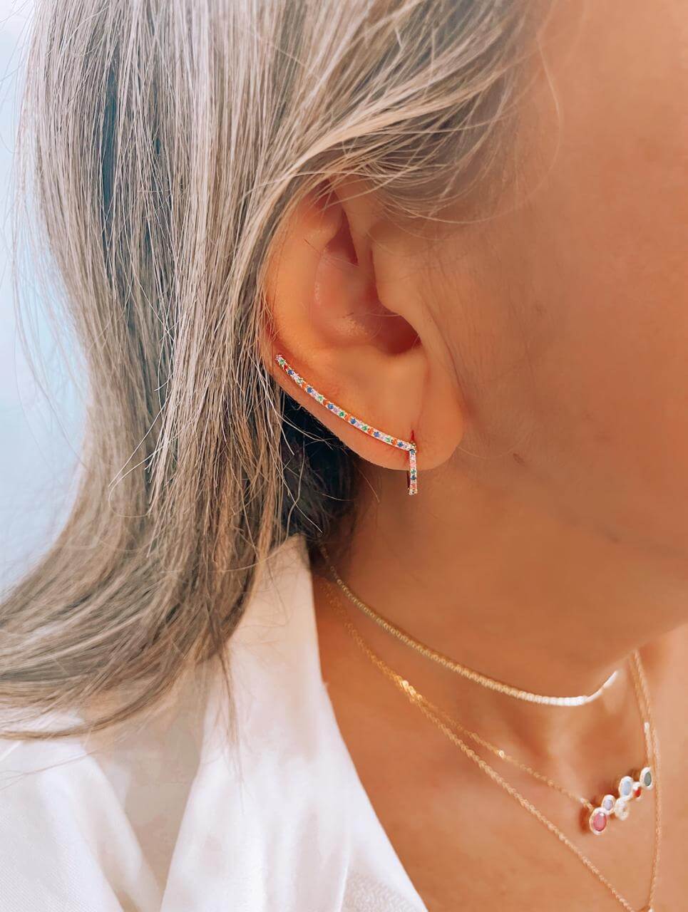 Tipo mini candongas hechas de plata 925 con rodio o enchape en oro de 24 kilates y con engaste de mini circones multicolor.