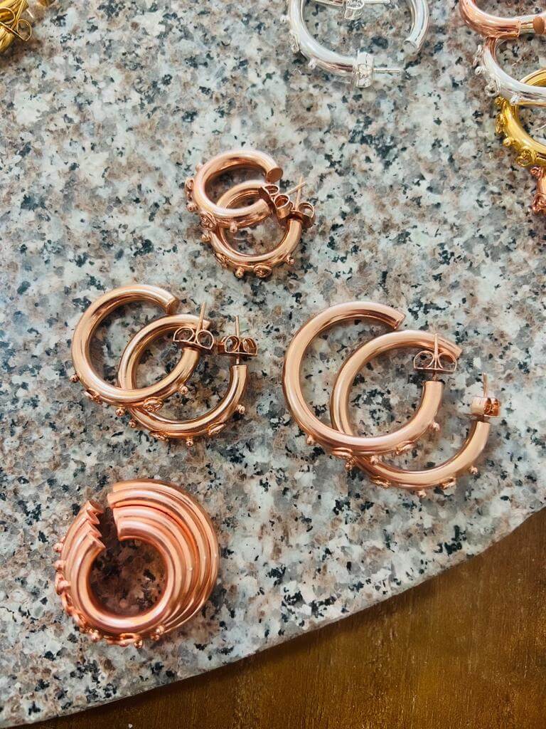 Tipo candongas o aros hechas de bronce con arabescos y con enchape en oro rosado.