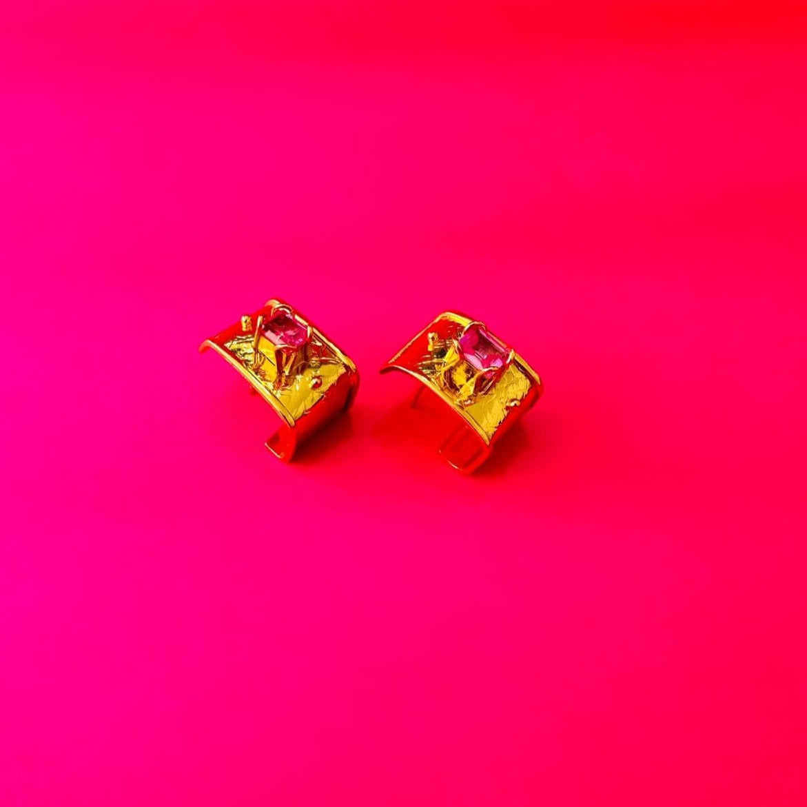 Tipo candongas cuadradas hechas en bronce martillado con enchape en oro de 24k y con engaste de circones: Rosa de Francia.