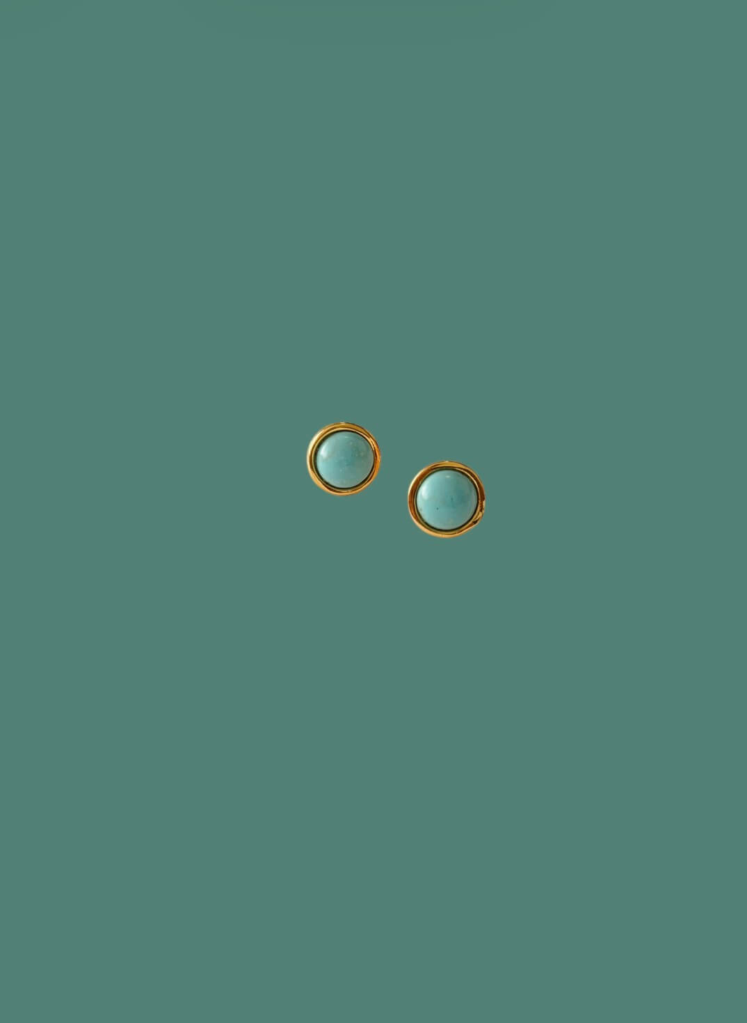 Topos mini mini en bronce con enchape en oro de 24K, con una turquesa de forma circular que destaca por su tono vibrante y acabado pulido.
