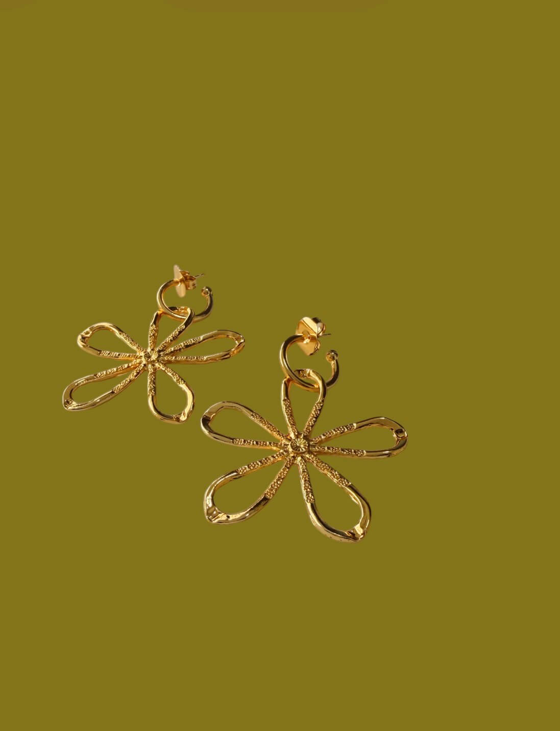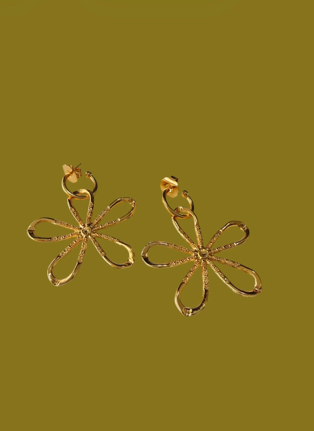 Aretes elaborados en bronce con enchape en plata, con un diseño floral lineal que aporta ligereza y movimiento.