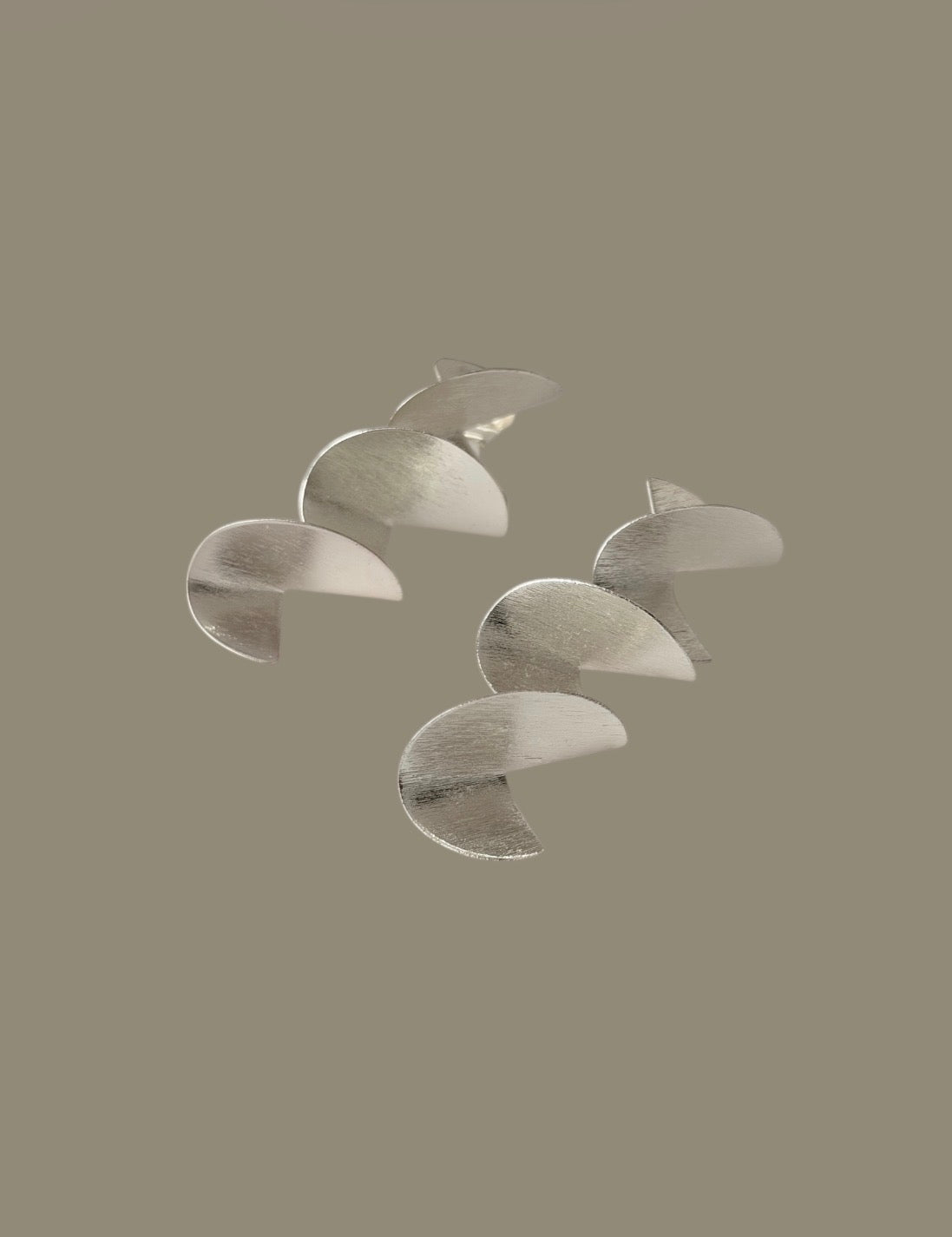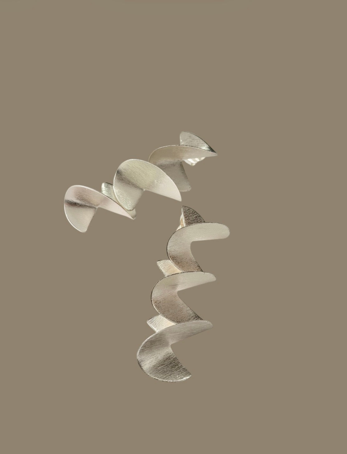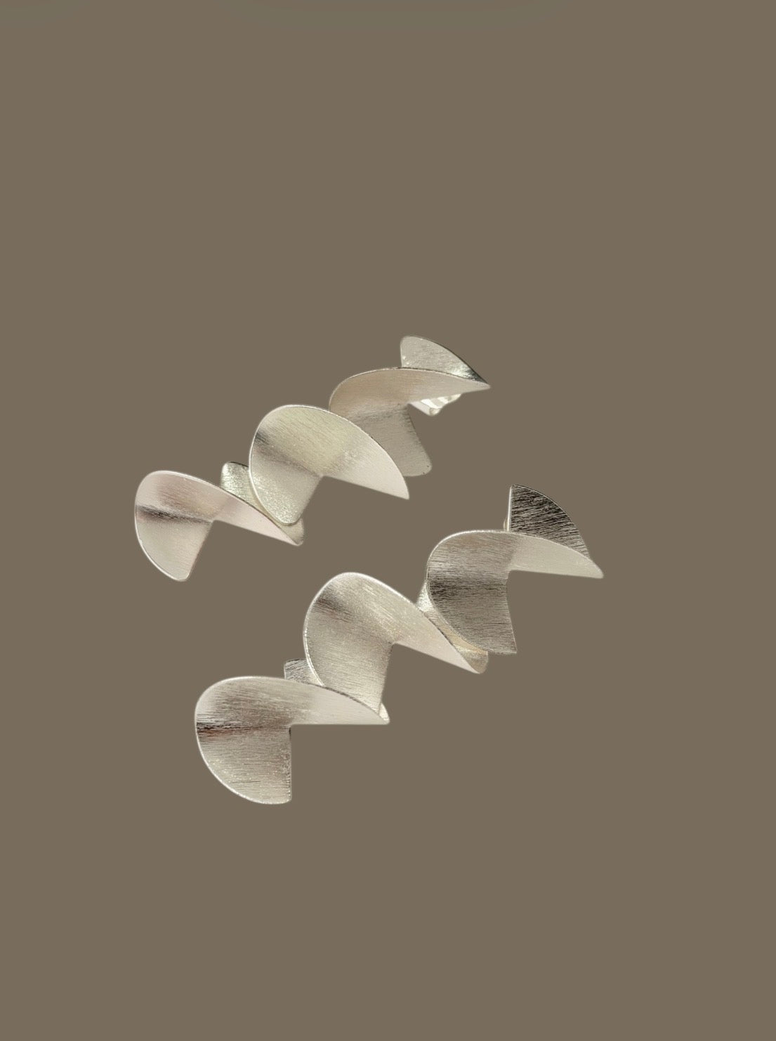 Aretes elaborados en bronce con enchape en plata, compuestos por piezas geométricas curvas dispuestas de forma vertical, creando un efecto de movimiento fluido y moderno.
