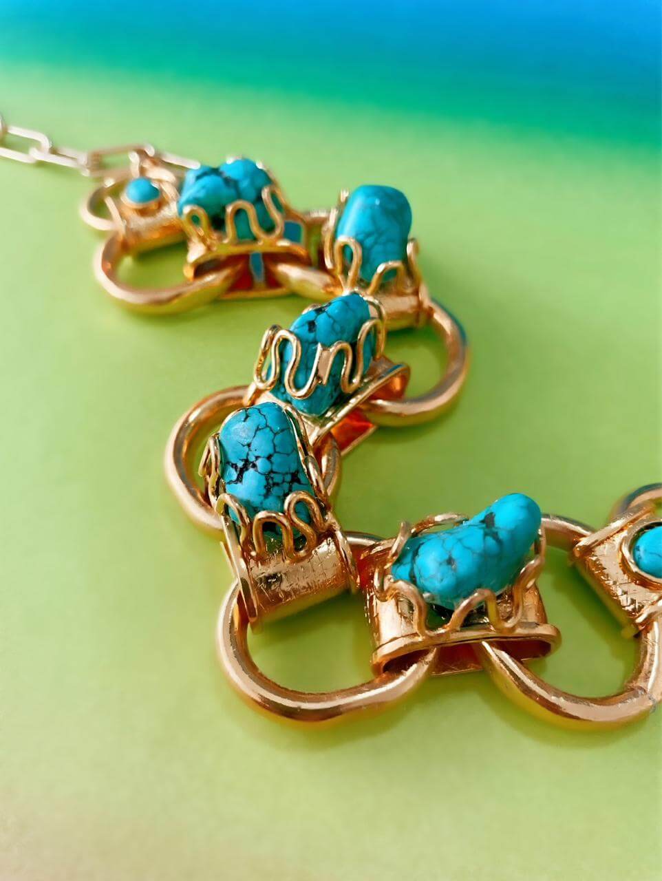 Hecho a mano de bronce con enchape en oro de 24 kilates y engaste de turquesa africana.