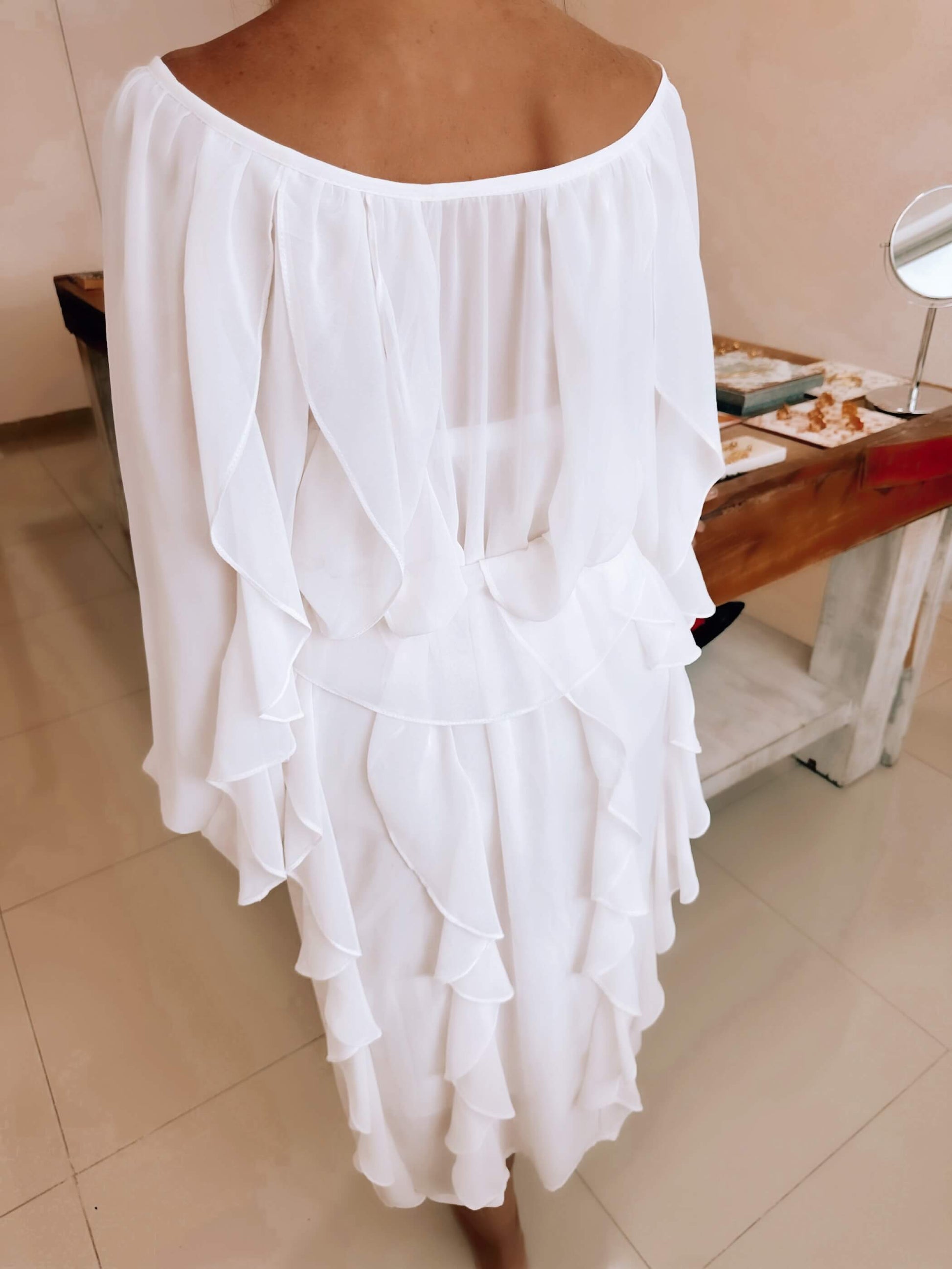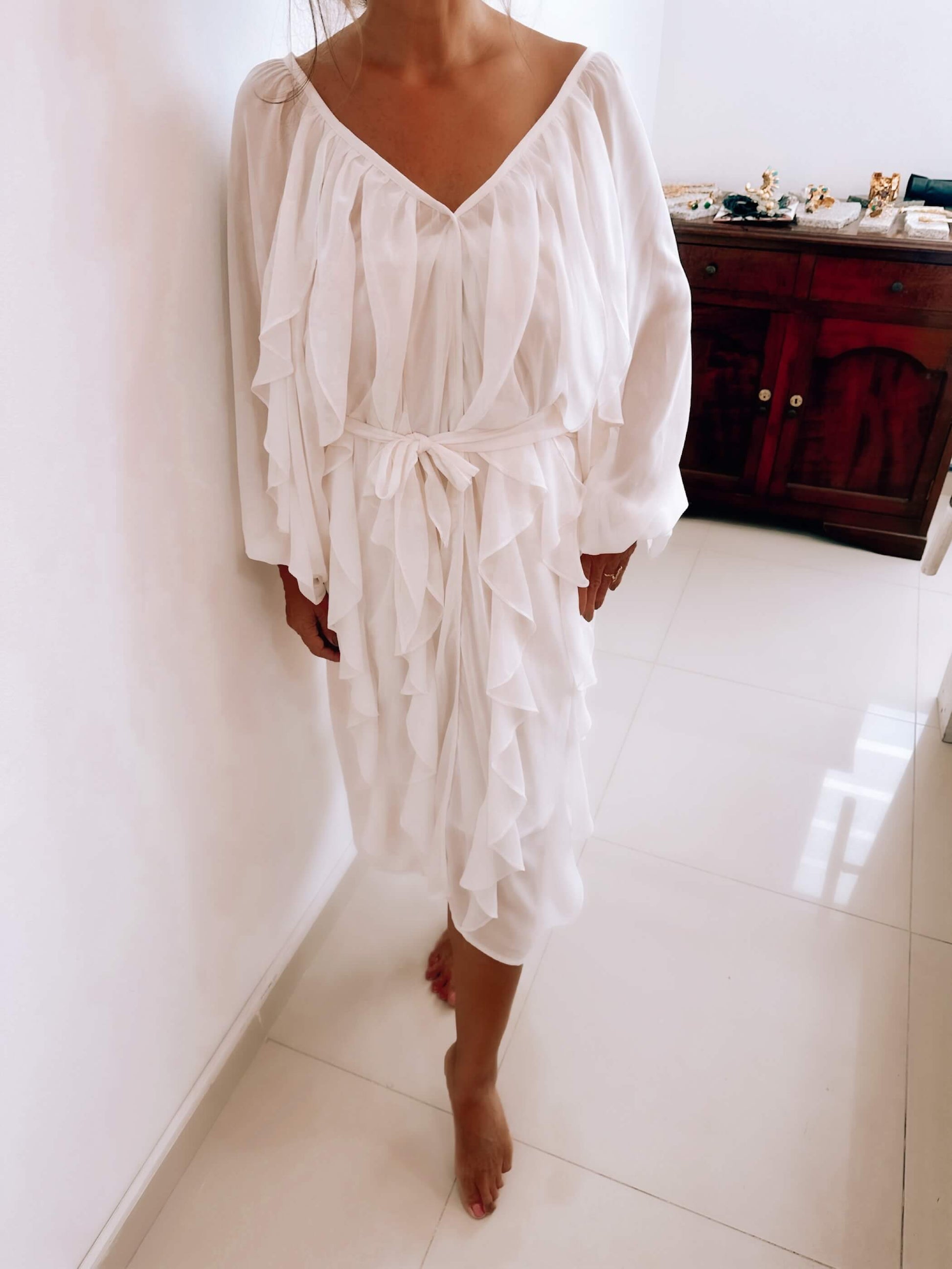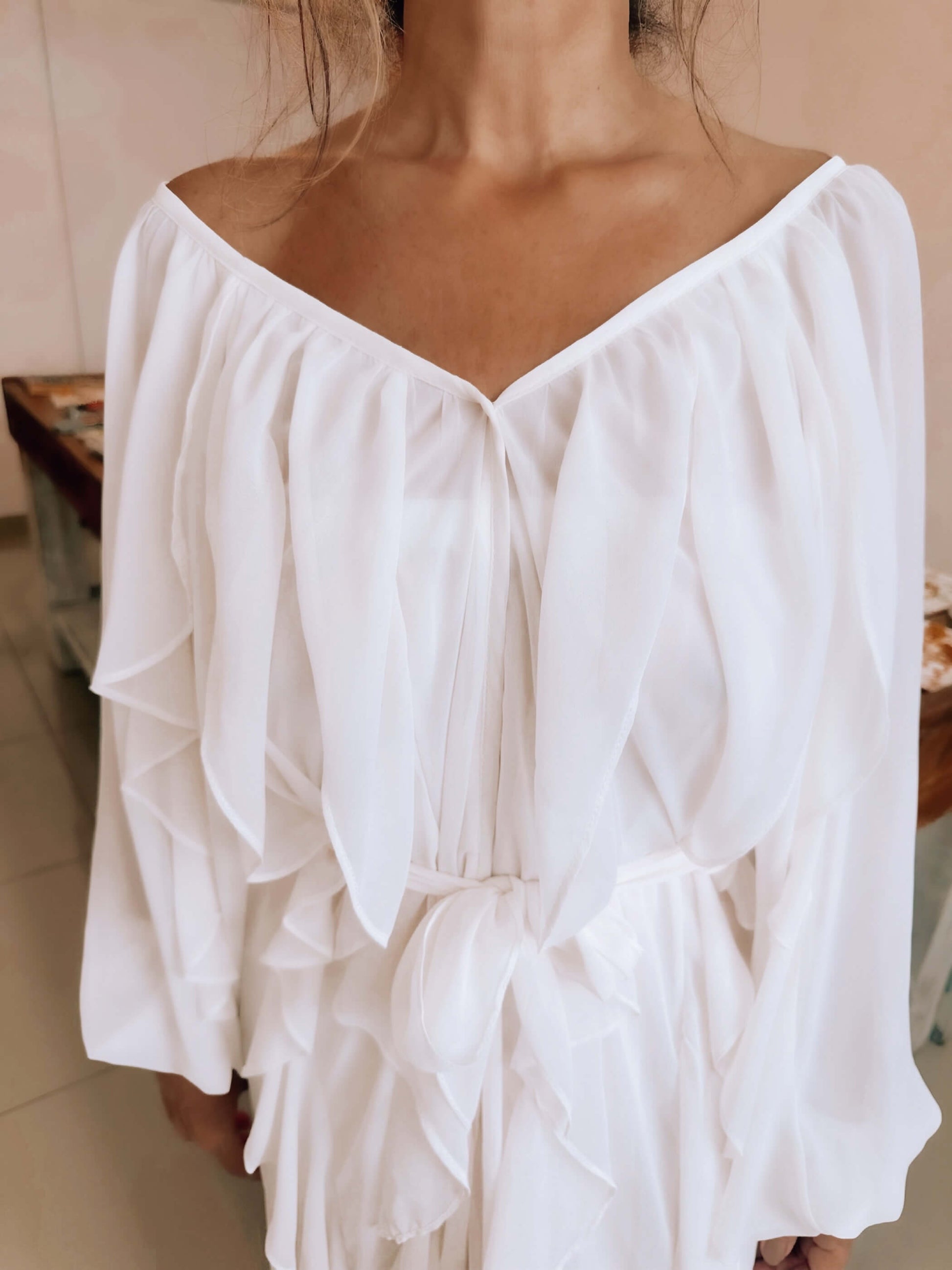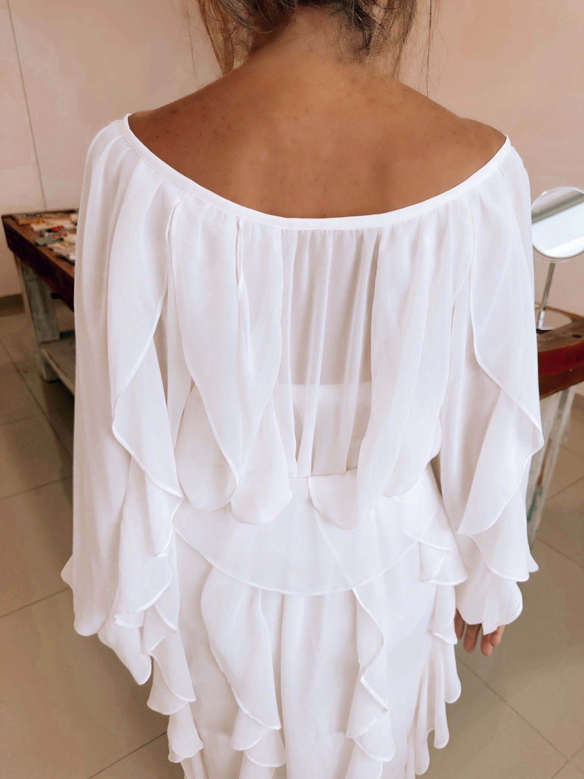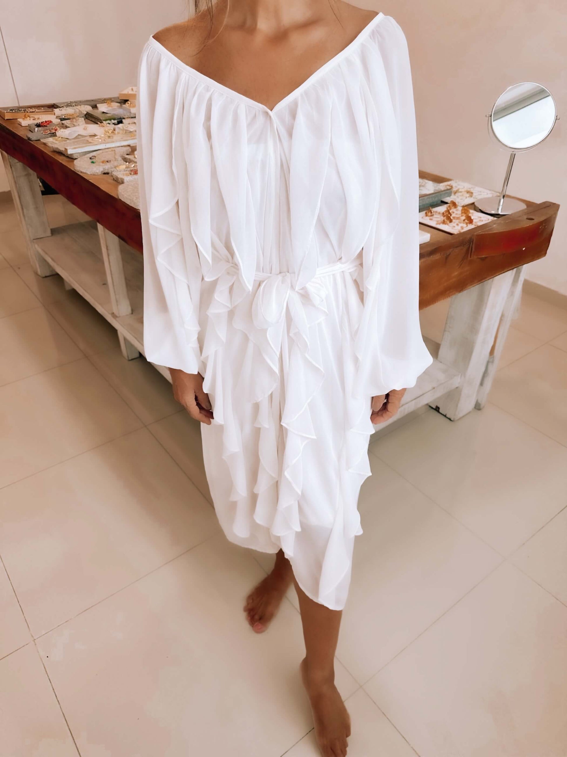 Vestido de vuelo ligero en velo, con escote en pico y mangas largas que caen con suavidad. Detalles de volantes en el mismo tejido que le dan movimiento y un aire romántico. Cierra al frente con delicados botones para un toque sutil y femenino.