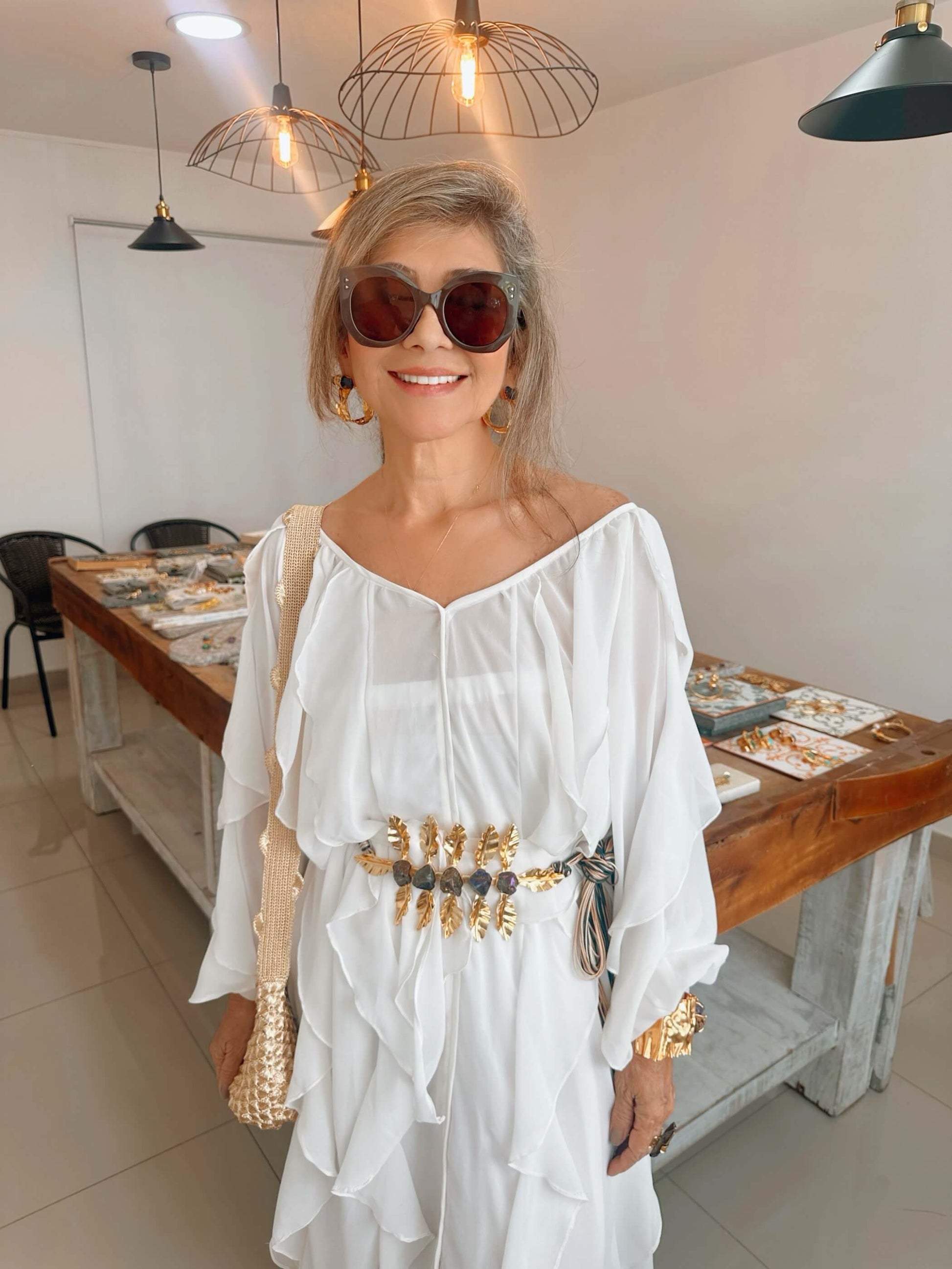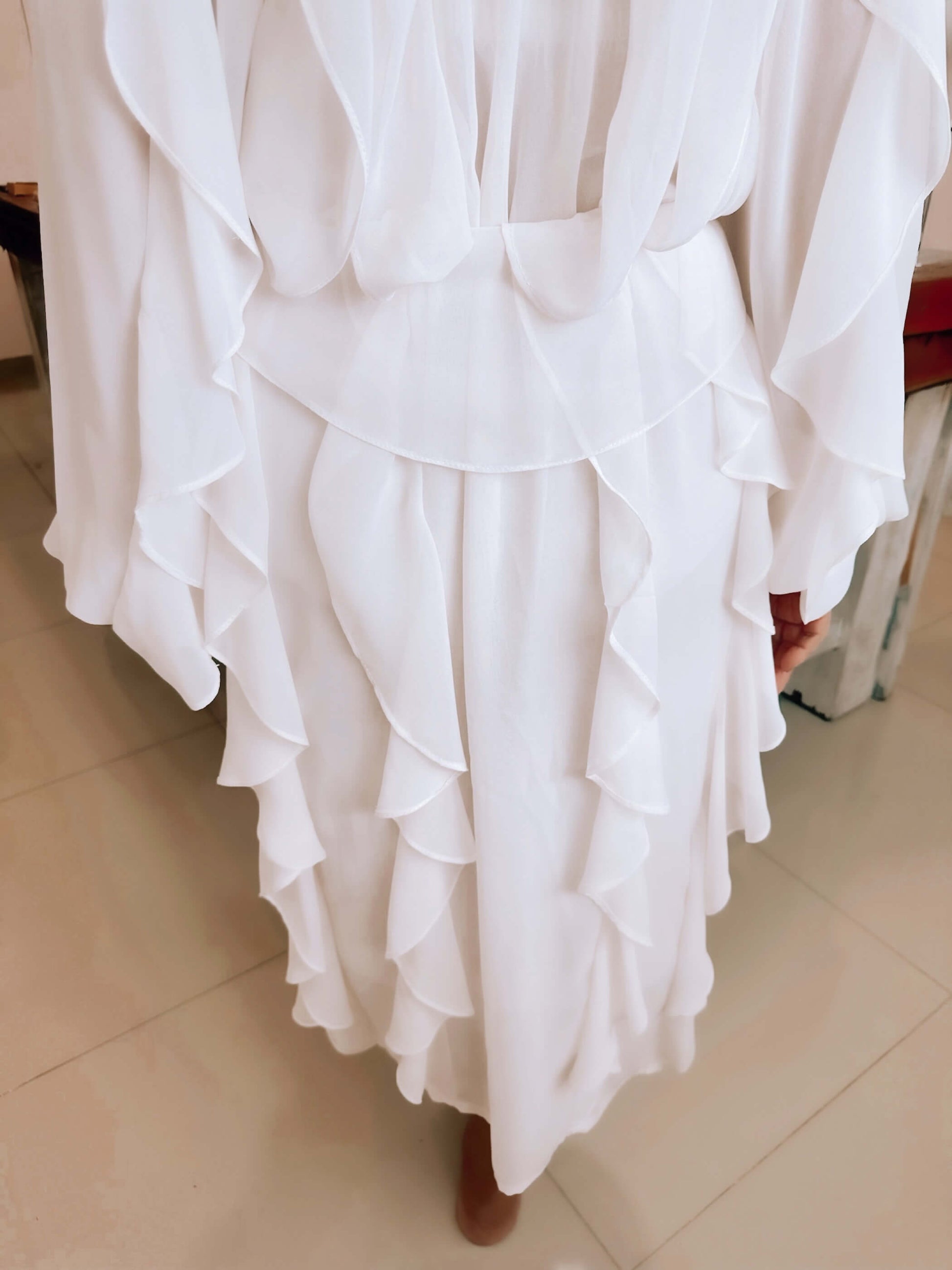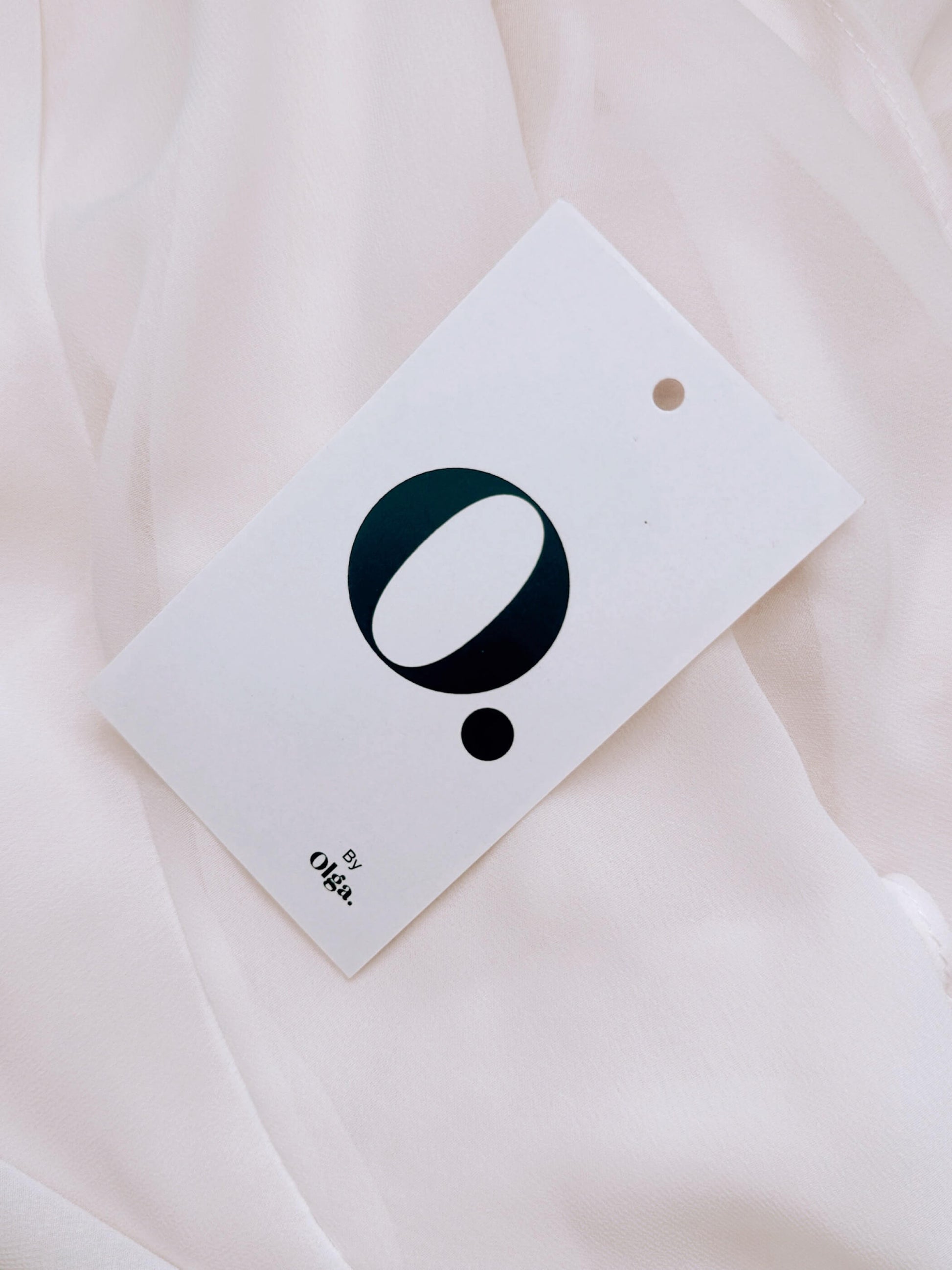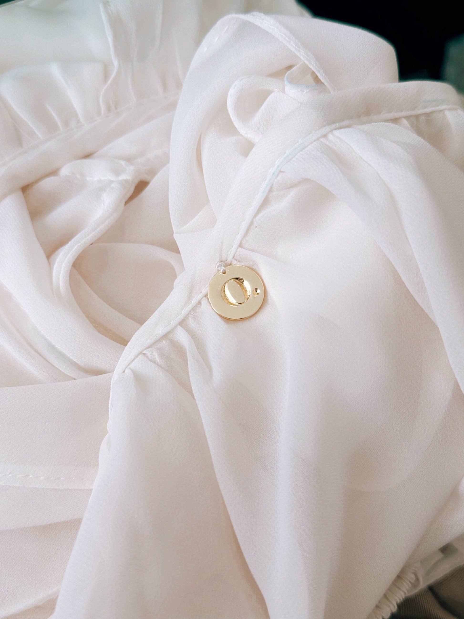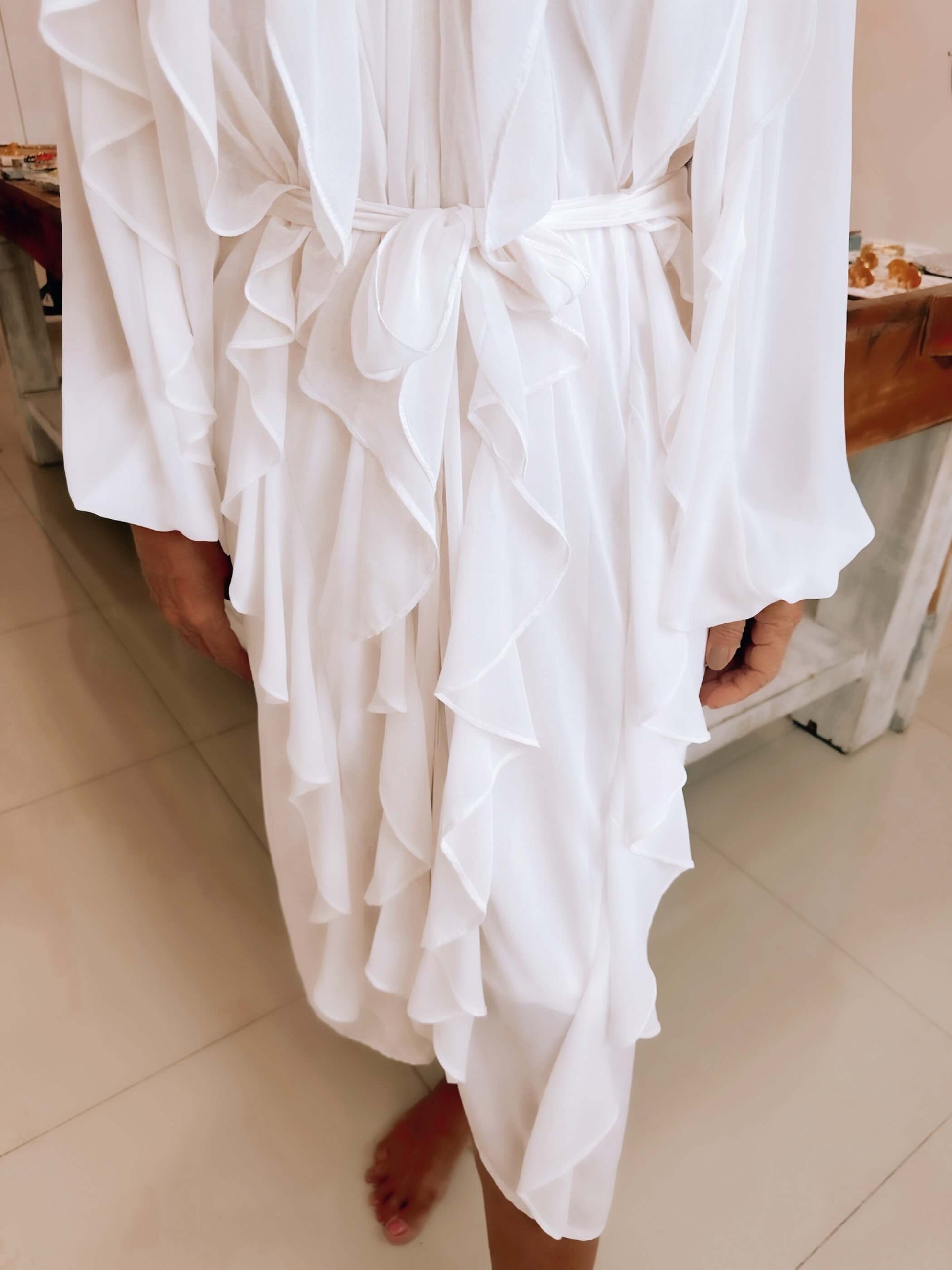 Vestido de vuelo ligero en velo, con escote en pico y mangas largas que caen con suavidad. Detalles de volantes en el mismo tejido que le dan movimiento y un aire romántico. Cierra al frente con delicados botones para un toque sutil y femenino.