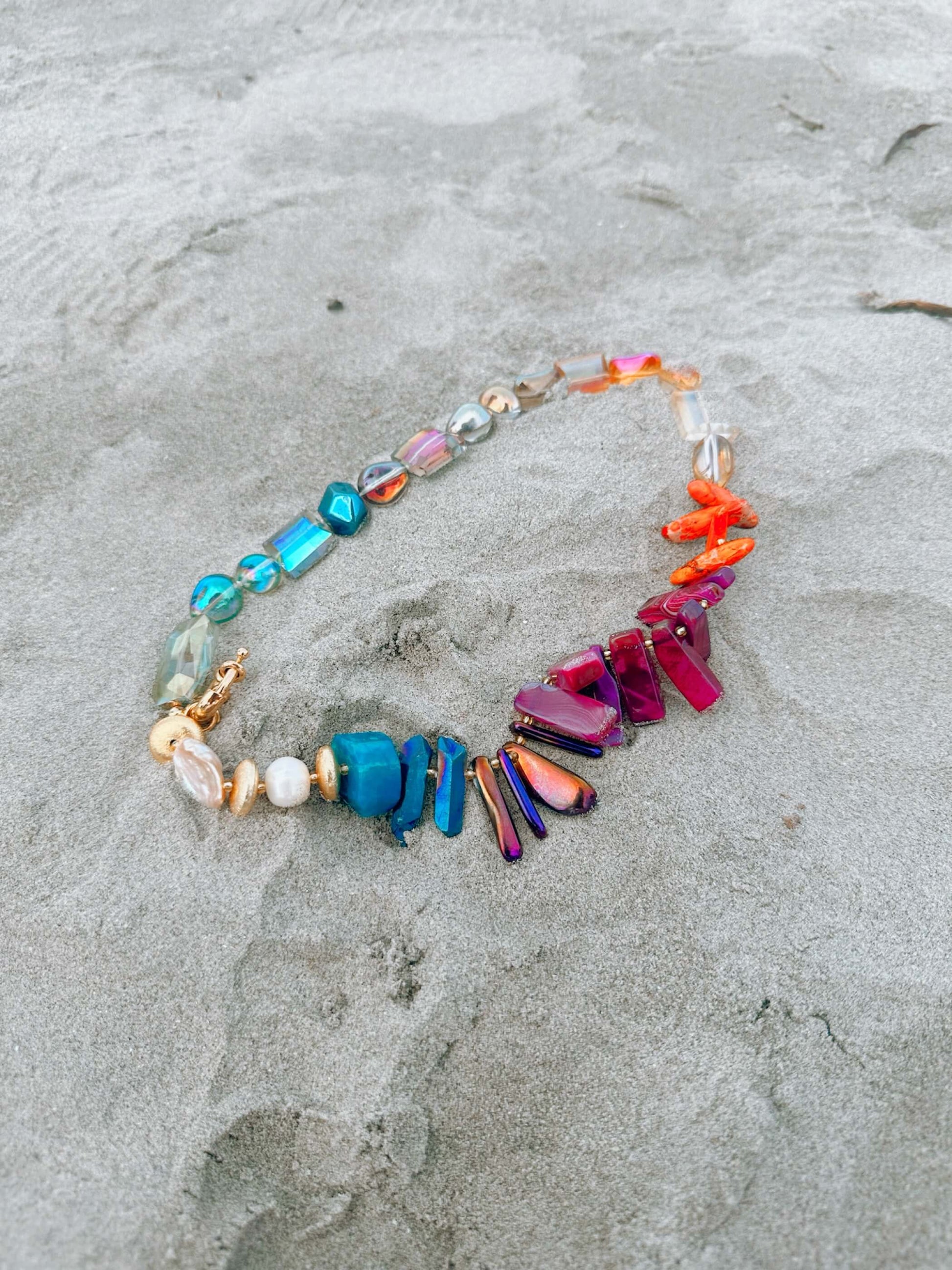 Un collar con múltiples piedras semipreciosas multicolores, perlas cultivadas, cristales facetados y piezas enchapadas en oro de 24k adornado con nuestra selección favorita de broches vintage.